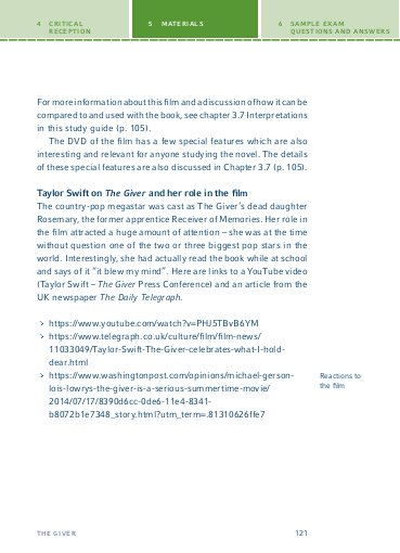 1 AT A GLANCE - THE MOST IMPORTANT POINTS2 LOIS LOWRY: LIFE & WORKS2.1 Biography2.2 Contemporary BackgroundThe 1990s and the "end of history"Pop culture: Hybridisation and self-awareness"Sameness" in the book business2.3 Notes on Other Important Works3 ANALYSES AND INTERPRETATIONS3.1 Origins and Sources3.2 Summaries3.3 Structure3.4 CharactersJonasThe GiverJonas´ familyJonas´ motherJonas´ fatherLilyGabriel/GabeJonas´ friendsAsherFionaOther charactersPeople in The GiverConstellations3.5 ThemesControlTotalitarian societiesMethods of controlSameness vs. diversityMemory, history and the pastChoiceHuman connections3.6 Style and LanguageThe use of languageStyle3.7 Approaches to InterpretationYoung adult (YA) fictionScience Fiction (SF)Dystopian literatureFilm adaptation (2014)Other ideas about interpretations of The GiverEscape or death?Metaphor for adolescence4 CRITICAL RECEPTIONPraise and accoladesAwardsChallengesNegative responses5 MATERIALSLowry on Science Fiction and The GiverThe film adaptation: The GiverGeorge Orwell and dystopian fictionThe Giver on book lists6 SAMPLE EXAM QUESTIONS AND ANSWERSSOURCES & REFERENCESINDEX