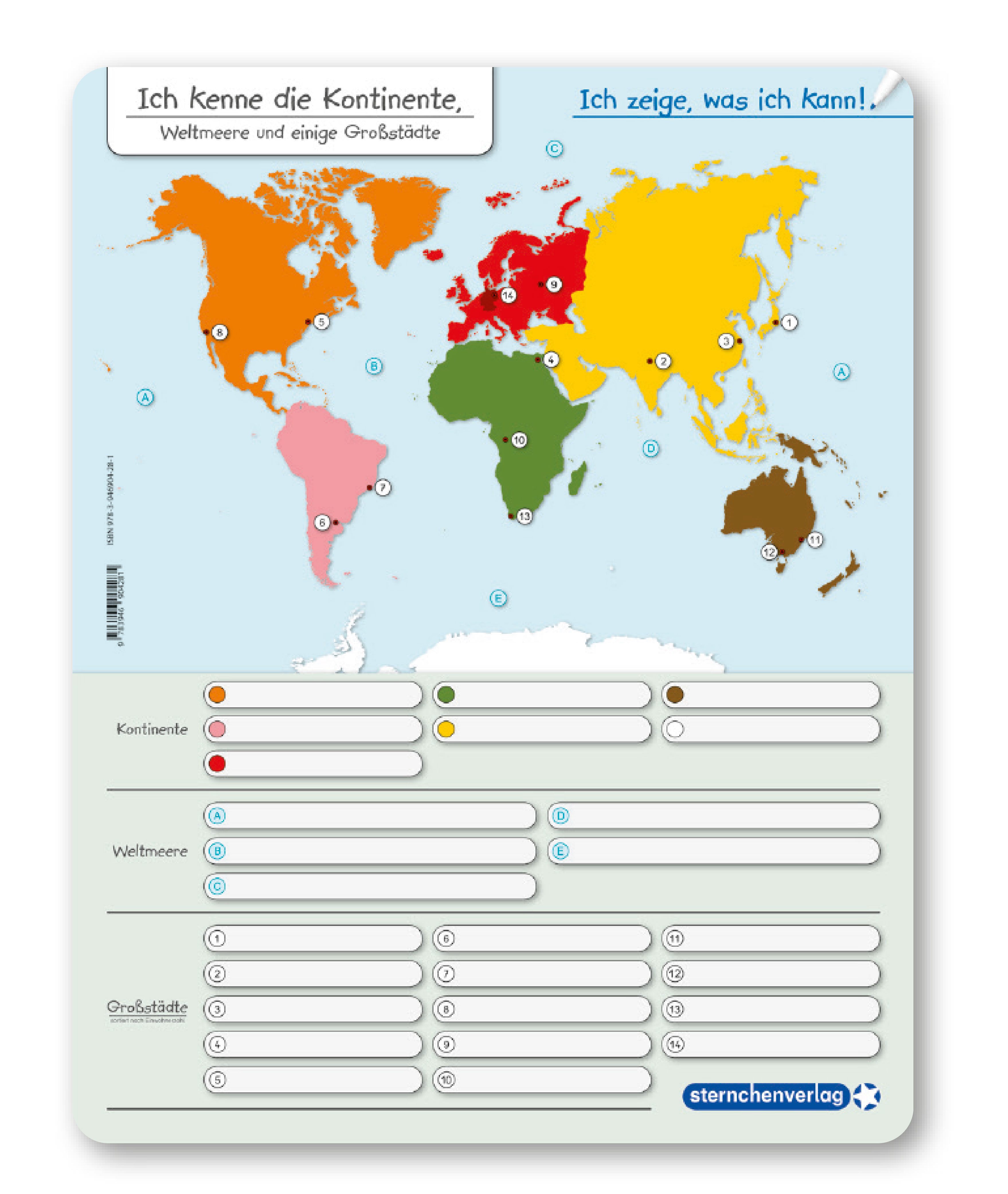 Hier können die Kontinente, Weltmeere und einige Großstädte immer wieder geübt werden.
