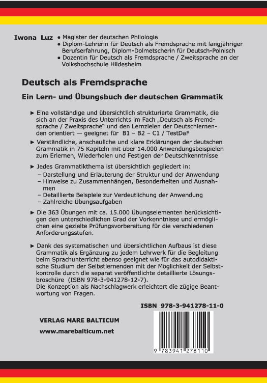 Dank des systematischen und übersichtlichen Aufbaus ist diese lehrwerksunabhängige Grammatik für die Begleitung beim Sprachunterricht sowie zur Vorbereitung auf alle Prüfungen im Bereich DaF (ab dem Niveau B1 bis hin zu den Deutschprüfungen für den Hochschulzugang) ebenso geeignet wie für das autodidaktische Studium der Selbstlernenden mit der Möglichkeit der Selbstkontrolle durch die separat veröffentlichte detaillierte Lösungsbroschüre.
