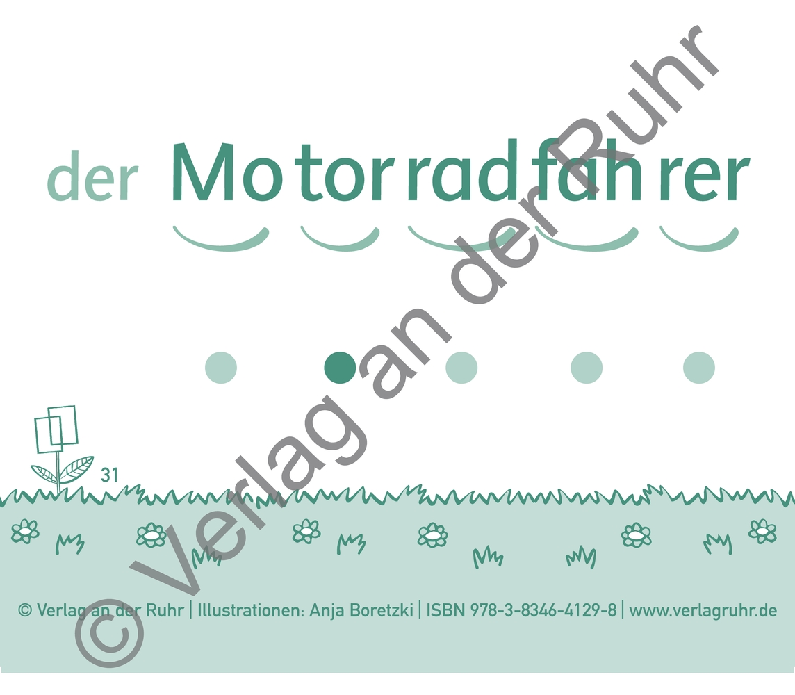 Ob geklatscht, gestampft oder gesprochen: Sprache in Silben gliedern zu können bereitet perfekt auf spätere Lese- und Schreibfähigkeiten vor. Von Fuchs bis Ma-ri-en-kä-fer: Diese Karten enthalten ein- bis fünfsilbige Wörter, die jeweils durch eine klare Abbildung dargestellt werden. Punkte und Silbenbögen auf der Rückseite bieten die Möglichkeit der Selbstkontrolle.