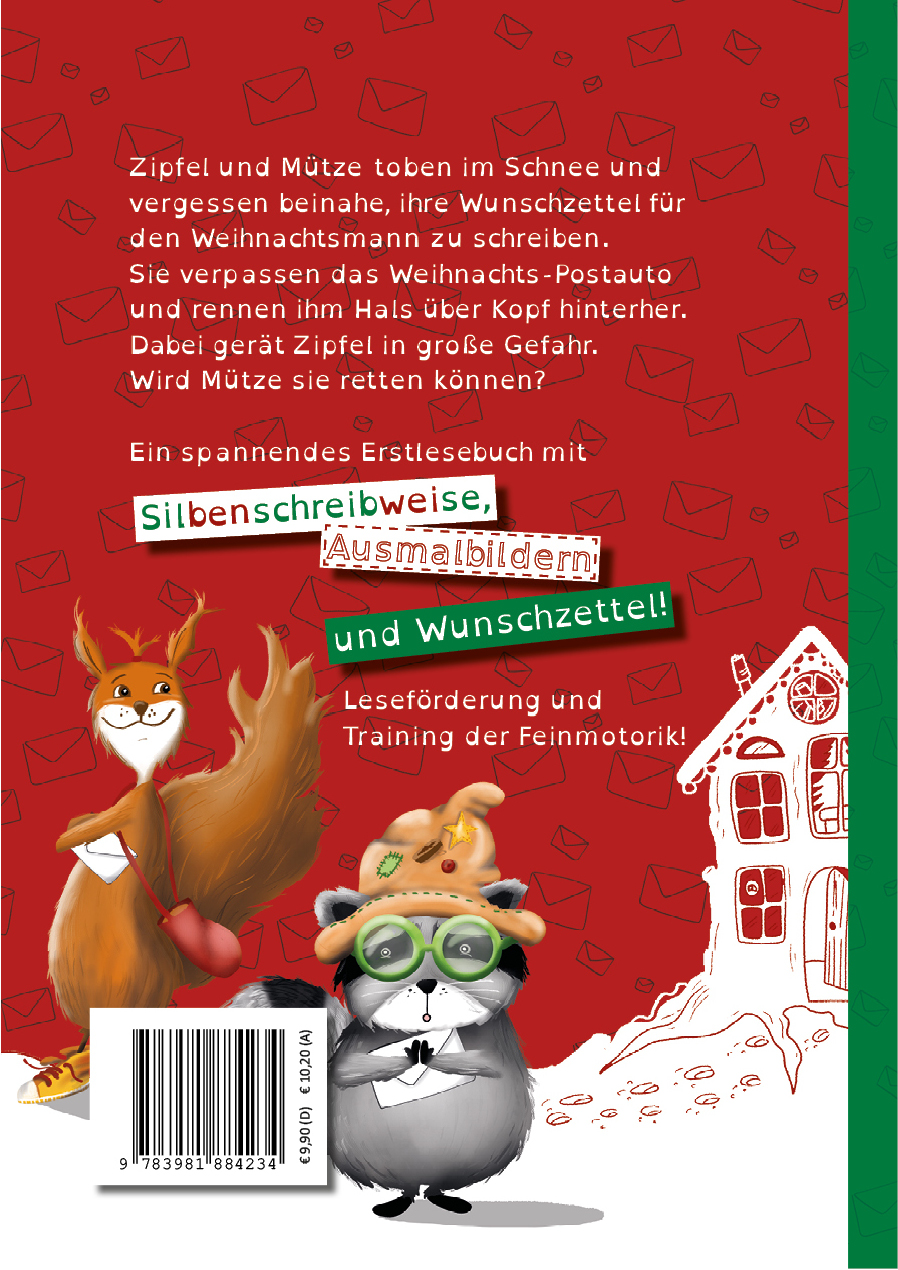 Zipfel und Mütze toben im Schnee und vergessen beinahe, ihre Wunschzettel für den Weihnachtsmann zu schreiben. Sie verpassen das Weihnachts-Postauto und rennen ihm Hals über Kopf hinterher. Dabei gerät Zipfel in große Gefahr. Wird Mütze sie retten können?Ein spannendes Erstlesebuch mit Silbenschreibweise, Ausmalbildern und Wunschzettel-Bastelbogen.Leseförderung und Training der Feinmotorik.Incl. Lesezeichen mit Rätsel für Leseprofis.Auch geeignet für Legastheniker.