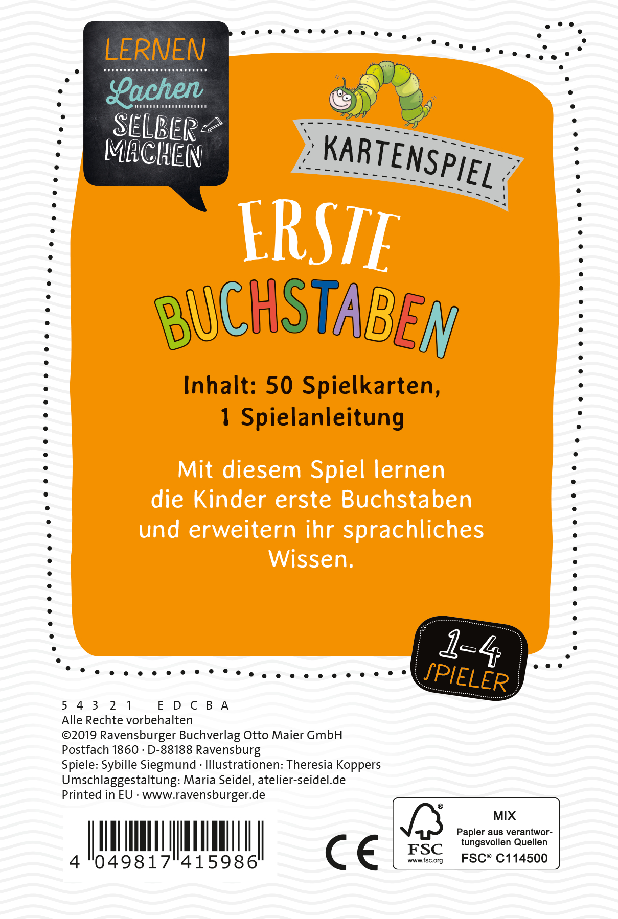 Dieses Lernspiel fördert das Kennenlernen der Buchstaben sowie die Sprachwahrnehmung und Sprachentwicklung. Es gibt vier kreative Spielmöglichkeiten von leicht bis schwer. Kinder erwerben so - ganz spielerisch - wichtige Vorkennnisse für die Schule. Für 1 - 4 Spieler.