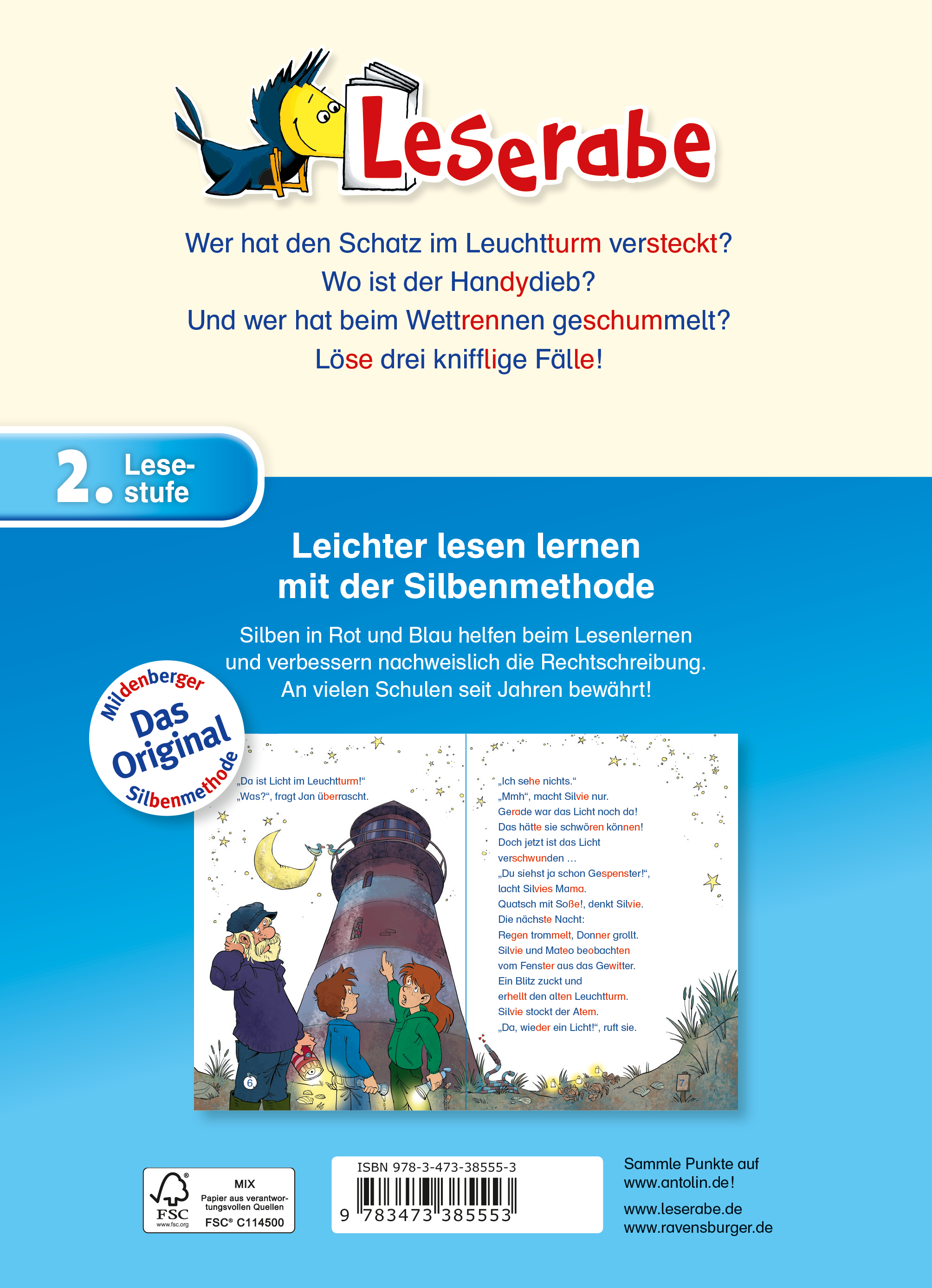 So macht Lesenlernen Spaß! Drei spannende Mitratekrimis: "Das Geheimnis im alten Leuchtturm": Nach dem Überfall auf einen Juwelier versteckt der Täter die Beute im Leuchtturm und kommt in der nahegelegenen Pension unter. Die Geschwister Silvieund Mateo sind mit ihren Eltern Gäste in derselben Pension und kommen dem Dieb auf die Schliche. "Der Dieb im Freibad": Marie verbringt mit ihrer Mutter den Tag im Freibad. Da stiehlt jemand das Handy ihrer Mutter. Marie findet heraus, wer der Täter ist. "Die Schummel-Brüder": Beim Waldlauf starten Rick, Timo und Philipp. Timo gewinnt. Es stellt sich jedoch heraus, das Timo unterwegs von seinem Zwillingsbruder Tobi abgelöst wurde und deshalb als Erster ins Ziel kam. Spannende Krimis zum Mitraten für Kinder ab Klasse 2.