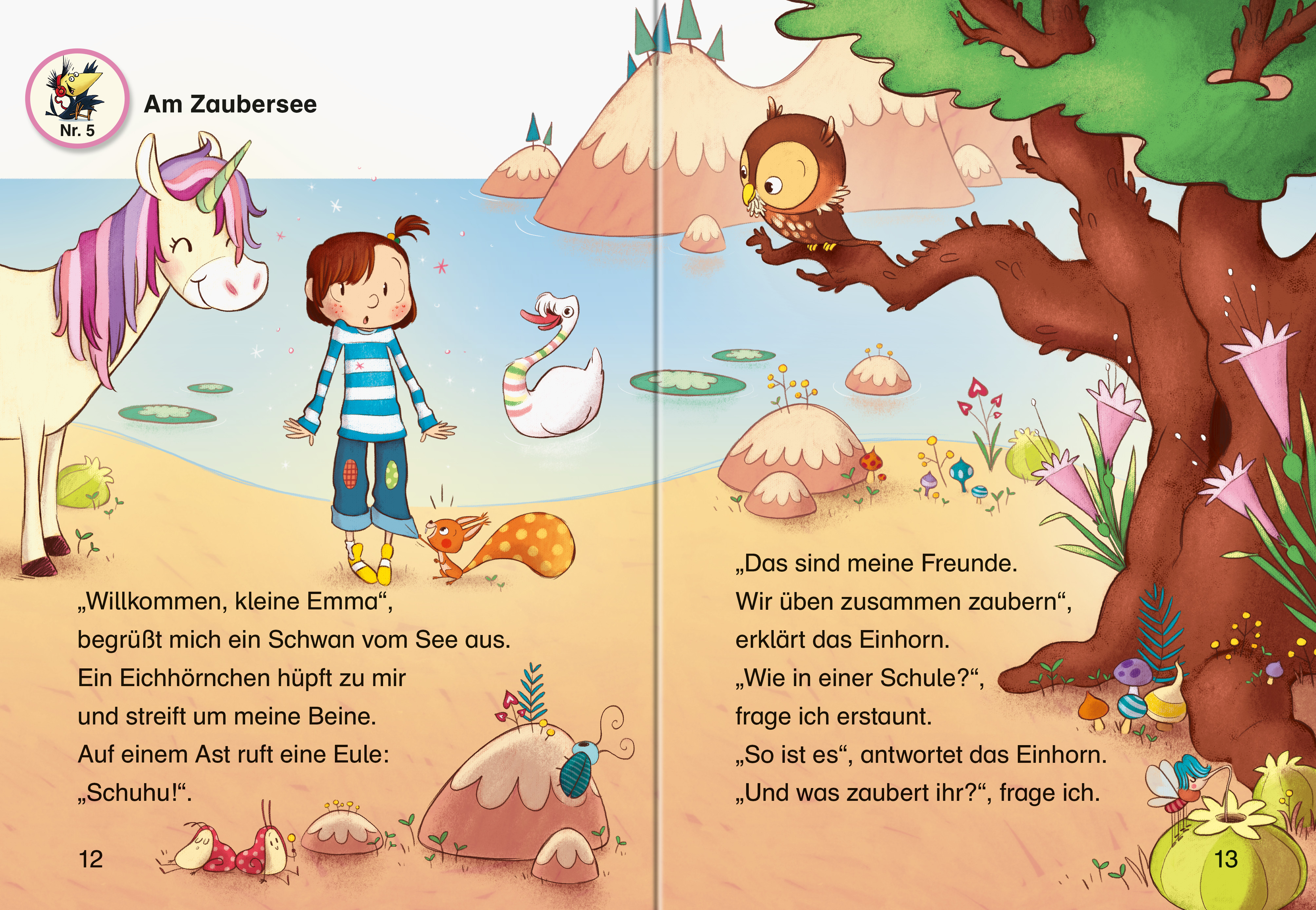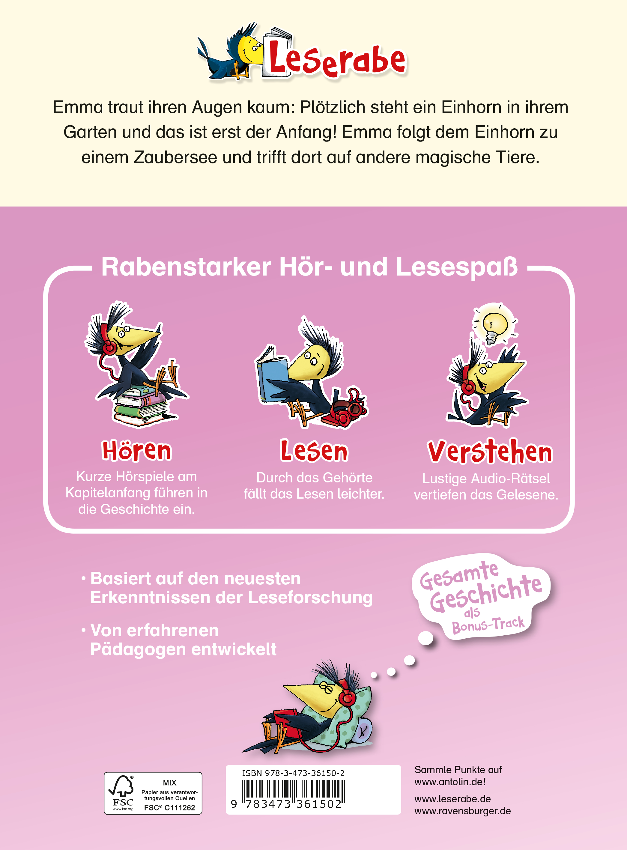 So macht Lesenlernen Spaß! Emma traut ihren Augen kaum: Plötzlich steht ein Einhorn in ihrem Garten und das ist erst der Anfang! Emma folgt dem Einhorn an einen verwunschenen Zaubersee und trifft dort noch auf andere magische Tiere: Ein Eichhörnchen, einen Schwan und eine Eule. Doch während das Eichhörnchen problemlos Nüsse regnen lassen kann und der Schwan einen Regenbogen herbeizaubert, müht sich die Eule mit einem Zauberbuch ab. Lesen ist schließlich gar nicht so einfach! Oder doch? Jetzt ist Emmas Hilfe gefragt! Zauberhafte Fantasiegeschichte für Erstleser ab 6 Jahren mit Audio-CD und Datei zum Download. Hören, lesen, verstehen! Die neue Reihe "Leserabe - Hör rein, lies los!" enthält kurze Geschichten für Kinder von 6 bis 8 Jahren. Lustige und spannende Hintergrundinformationen und Rätsel auf der beiliegenden Audio-CD fördern die Lesemotivation. Abgerundet wird die neue Leseraben-Reihe mit dem Hörbuch zum jeweiligen Titel. Die Audioinhalte sind auch als Download erhältlich!