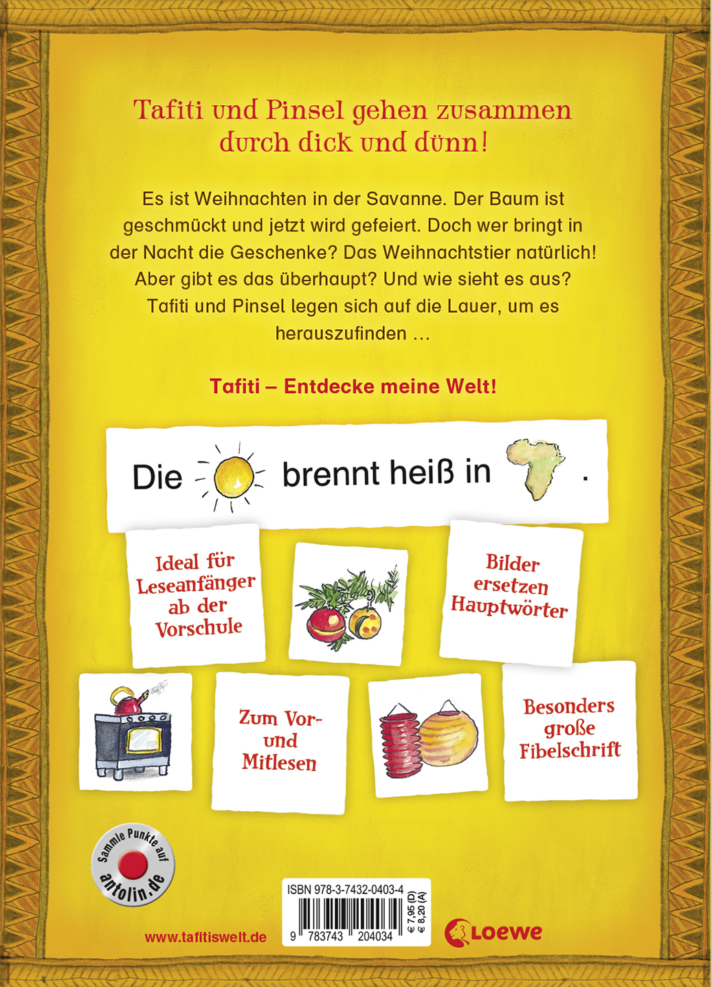 Es ist Weihnachten in der Savanne. Der Baum ist geschmückt und jetzt wird gefeiert. Nur: wer bringt in der Nacht die Geschenke? Das Weihnachtstier natürlich! Aber gibt es das überhaupt? Und wie sieht es aus? Tafiti und Pinsel legen sich auf die Lauer, um es herauszubekommen ...