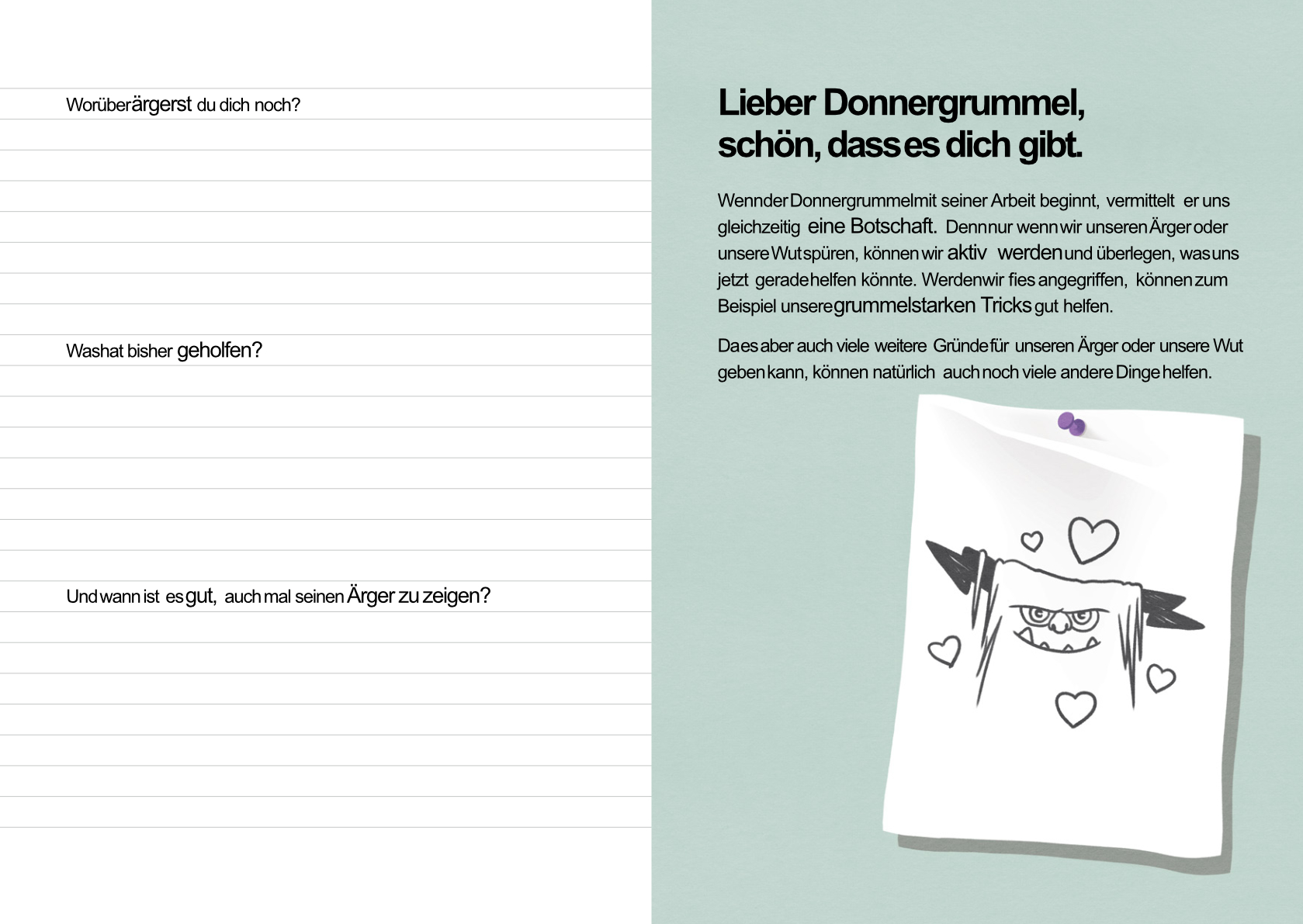 Mit diesem grummelstarken Begleitheft zum Buch, kannst du deinen Donnergrummel genauer kennenlernen. Hier gibt es viele Seiten zum Ausfüllen, ein paar tolle Tipps und genügend Platz für ein paar grummelstarke Tricks.