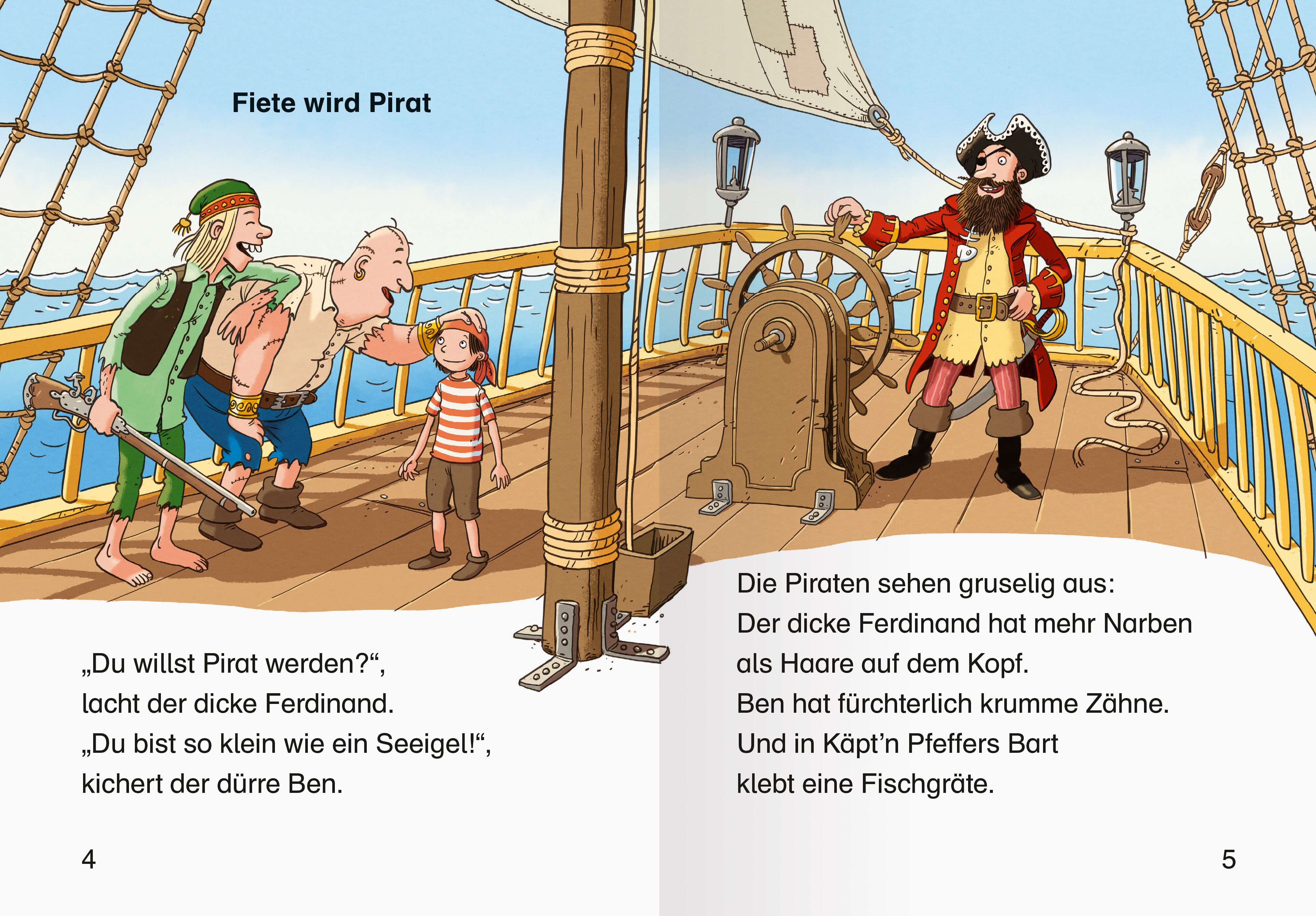 Fiete lernt Deck schrubben und Piratenlieder singen. Besonders gern hilft er Käpt'n Pfeffer in der Kombüse beim Kochen, und sein Essen kommt auch gut an bei den anderen Piraten. Aber am liebsten sitzt Fiete im Ausguck. Wann kommt endlich ein fremdes Schiff, das sie entern können? Deshalb ist er doch Pirat geworden! Sogar bei dem großen Sturm bleibt er oben hocken - und da kommt ein Handelsschiff in Sicht. Fertigmachen zum Entern! Fiete hat sich für seinen ersten Einsatz etwas ganz Besonderes überlegt: Am Seil schwingt er sich vom Ausguck auf das fremde Schiff! Aber der Sturm reißt ihn fort, er segelt über das Schiff hinweg und platscht ins Meer. Hilfe! Käpt'n Pfeffer wartet keine Sekunde und springt hinterher. Er rettet Fiete - aber wo sind die Schiffe? Da werden sie gepackt und aus dem Wasser gezogen - von den Seeleuten des Handelsschiffes! Am nächsten Tag liegen Fiete und Käpt'n Pfeffer krank im Bett. Käpt'n Pfeffer kommt ins Grübeln. Warum haben die Seeleute sie gerettet, obwohl sie gerade ihr Schiff entern wollten? Und ist Pirat wirklich das Richtige für einen Jungen wie Fiete? Aber Käpt'n Pfeffer kann nichts anderes als Pirat sein ... Da bringen die anderen Piraten den beiden Patienten das Essen - es schmeckt scheußlich. Ja, wenn nur Fiete und Käpt'n Pfeffer wieder kochen würden! Da hat der Käpt'n eine Idee. Er verkauft sein Schiff und kauft dafür ein kleines Hafenrestaurant. Und darin kochen er und Fiete das beste Piratenessen der Welt!