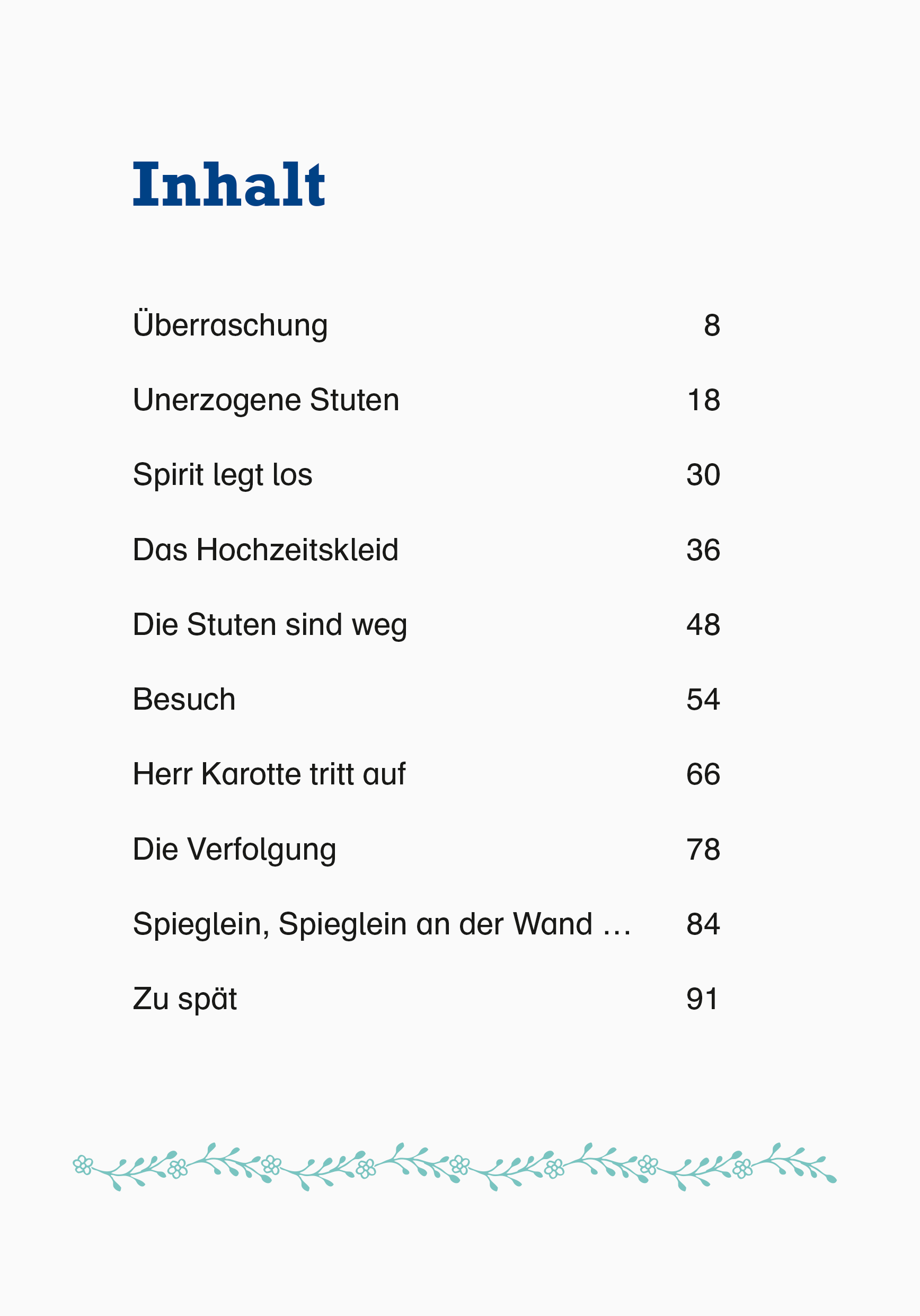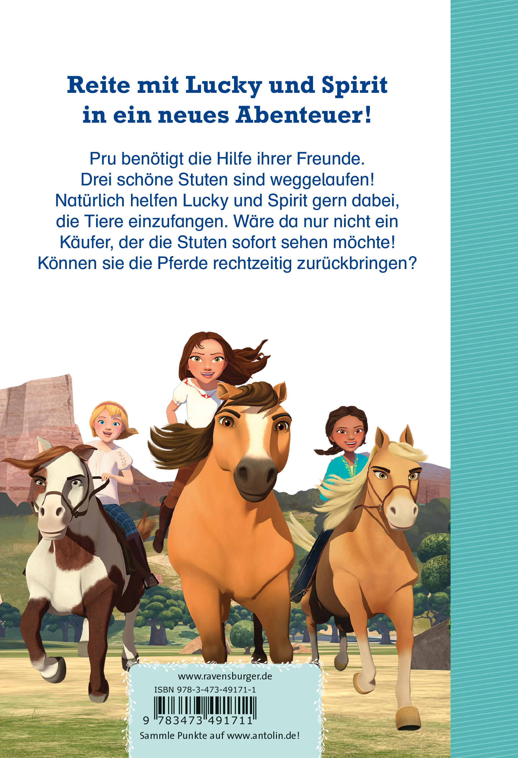 Auf Lucky und Spirit wartet ein großes Abenteuer: Ihre Freundin Pru benötigt Hilfe. Während ihr Vater verreist ist, sind drei Stuten aus dem Stall ausgebüxt. Ausgerechnet die, die Prus Vater verkaufen möchte. Natürlich sind Lucky und ihr Wildpferd Spirit sofort zur Stelle. Sie versuchen, die Pferde wieder einzufangen. Wäre da nur nicht ein ungeduldiger Käufer, der die Tiere sofort sehen möchte! Werden sie es schaffen, die Pferde rechtzeitig zurückzubringen?