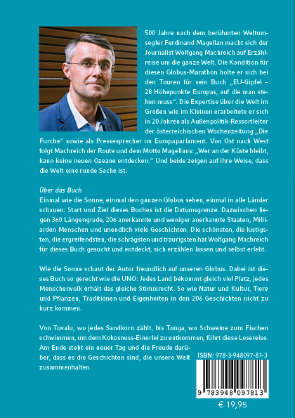Einmal wie die Sonne, einmal den ganzen Globus sehen, einmal in alle Länder schauen: Start und Ziel dieses Buches ist die Datumsgrenze. Dazwischen liegen 360 Längengrade, 206 anerkannte und weniger anerkannte Staaten, Milliarden Menschen und unendlich viele Geschichten. Die schönsten, die lustigsten, die ergreifendsten, die schrägsten und traurigsten hat Wolfgang Machreich für dieses Buch gesucht und entdeckt, sich erzählen lassen und selbst erlebt. Wie die Sonne schaut der Autor freundlich auf unseren Globus. Dabei ist dieses Buch so gerecht wie die UNO: Jedes Land bekommt gleich viel Platz, jedes Menschenvolk erhält das gleiche Stimmrecht. So wie Natur und Kultur, Tiere und Pflanzen, Traditionen und Eigenheiten in den 206 Geschichten nicht zu kurz kommen. Von Tuvalu, wo jedes Sandkorn zählt, bis Tonga, wo Schweine zum Fischen schwimmen, um dem Kokosnuss-Einerlei zu entkommen, führt diese Lese-Reise. Am Ende steht ein neuer Tag und die Freude darüber, dass es die Geschichten sind, die unsere Welt zusammenhalten.