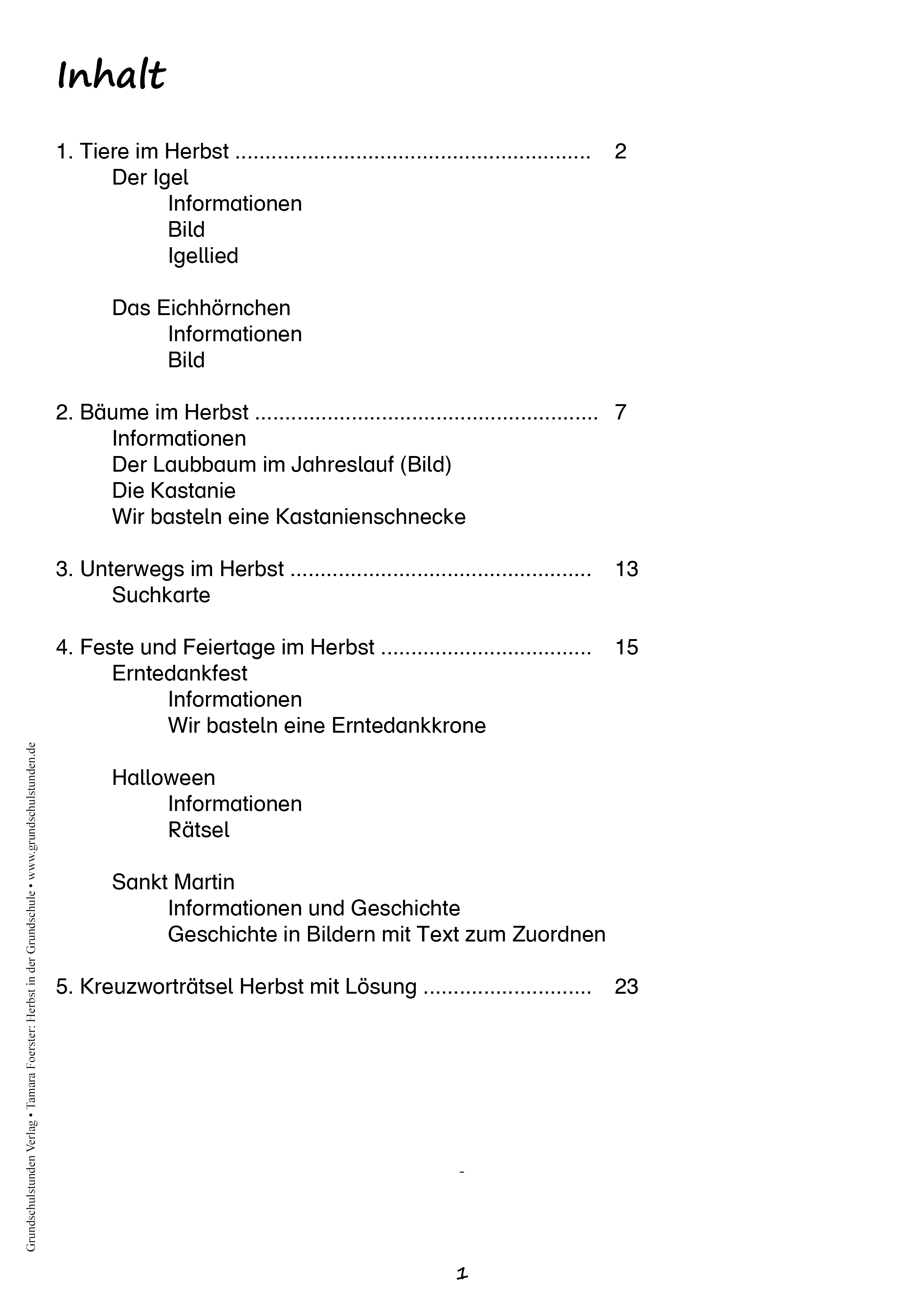Tiere im Herbst (Igel und Eichhörnchen mit Bild und Informationen), Bäume im Herbst (Laubbäume, Kastanie, Wir basteln eine Kastanien-Schnecke), unterwegs im Herbst mit Suchkarte, Feste und Feiertage im Herbst (Erntedank, Sankt Martin und Halloween mit Informationen, Basteleien, Bildkarten) und ein Kreuzworträtsel zum Thema Herbst.