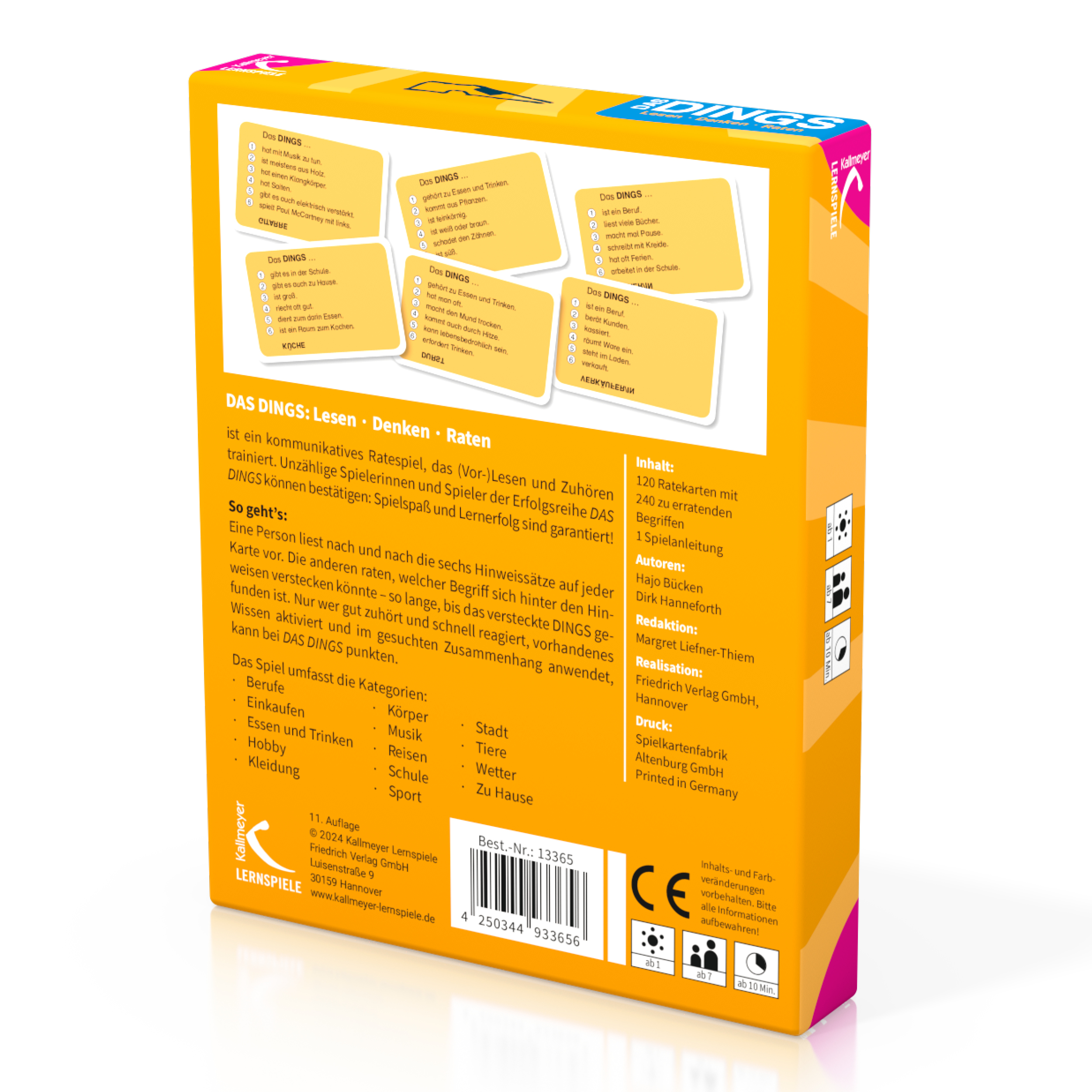 Wer findet als Erster das gesuchte Wort?Was ist das? Es hat mit Musik zu tun. Es ist meistens aus Holz und hat einen Klangkörper. Weißt du es schon?Das DINGS ist ein tolles Ratespiel - auch für größere Gruppen! Ein Spieler liest nach und nach die sechs Hinweissätze auf der Karte vor, die anderen versuchen, das versteckte Wort so schnell wie möglich zu erraten. Setzen Sie Das DINGS im Unterricht vielfältig ein: Sie können damit Themen wie z.B. Berufe, Körper, Tiere und Kleidung spielerisch aufgreifen oder Sie üben mit den Kindern das Vorlesen und Zuhören. Denn nur, wer gut zuhört kann punkten! Beim Spielen lernen die Kinder schwierige Wörter als Synonyme kennen, sie lernen wie Dinge umschrieben werden und dass Dinge sich auf verschiedene Weise charakterisieren lassen.