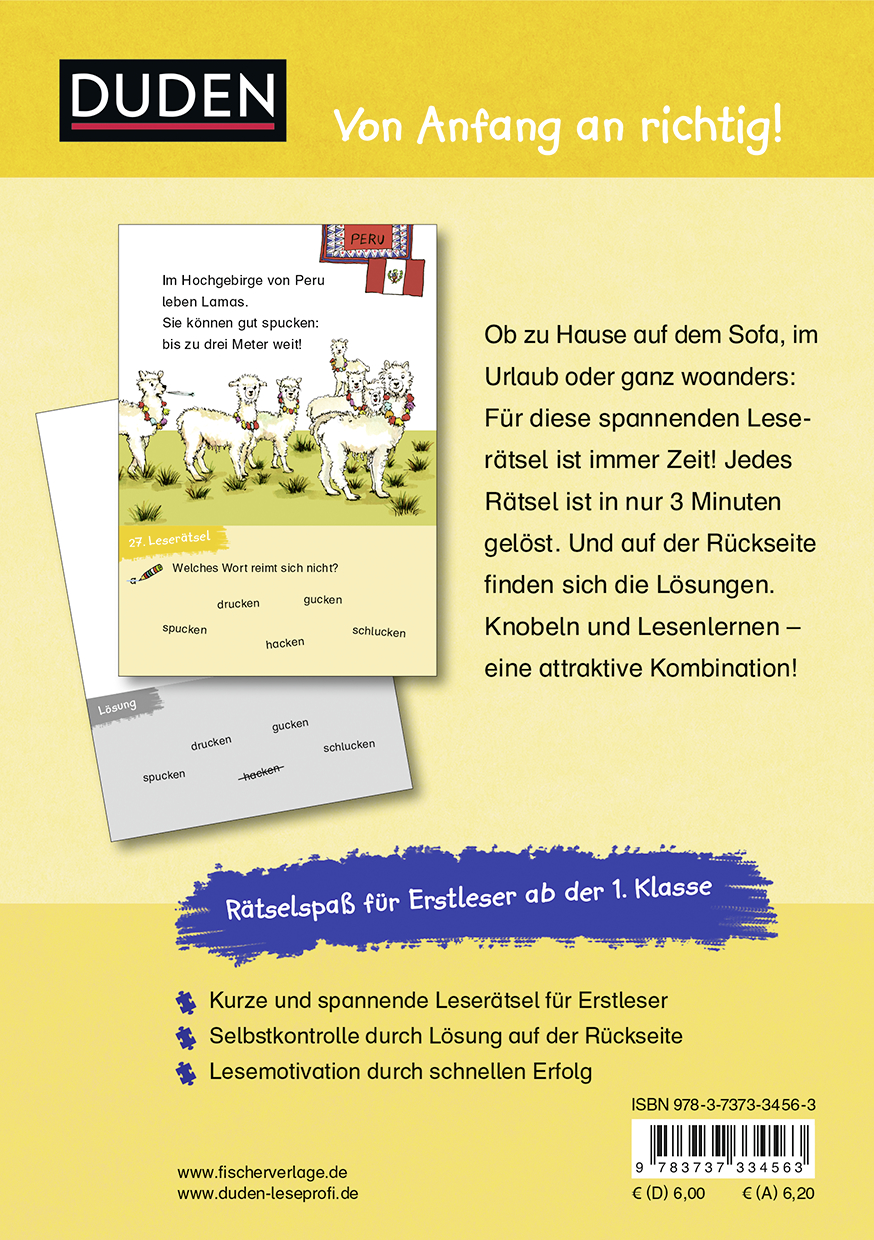 Ob zu Hause auf der Couch, in den Ferien oder ganz woanders: Für diese spannenden Leserätsel zum spannenden Thema "Weltreise" ist immer Zeit! In nur 3 Minuten haben die Erstleser ein Rätsel gelöst und mittels der Lösung auf der Rückseite herausgefunden, ob sie richtig liegen. Mit Länderflaggen zu 40 Ländern!