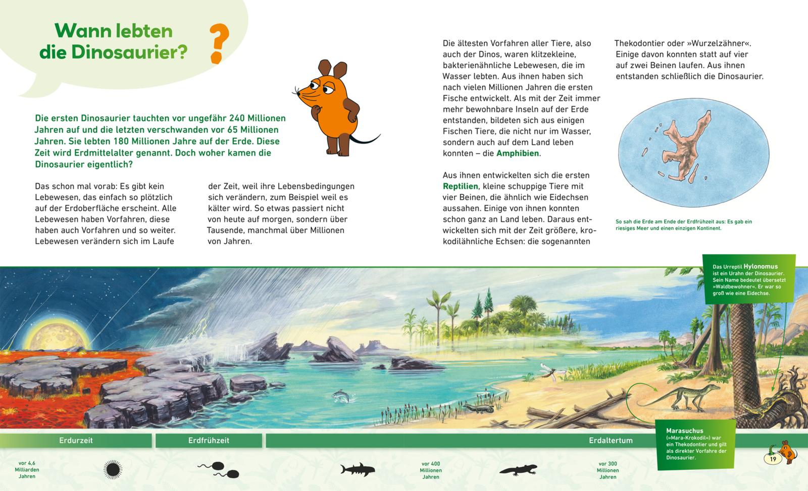 Die Dinosaurier lebten lange bevor es Menschen gab. Trotzdem faszinieren sie immer wieder neue Generationen von Kindern. Auf einer spannenden Entdeckungsreise in die Vergangenheit unserer Erde beantwortet die Maus knifflige Kinderfragen rund um Körperbau, Aussehen, Ernährung und Verteidigung der faszinierenden Echsen. Spielerisch, sachlich fundiert und immer mit dem besonderen Maus-Faktor!
