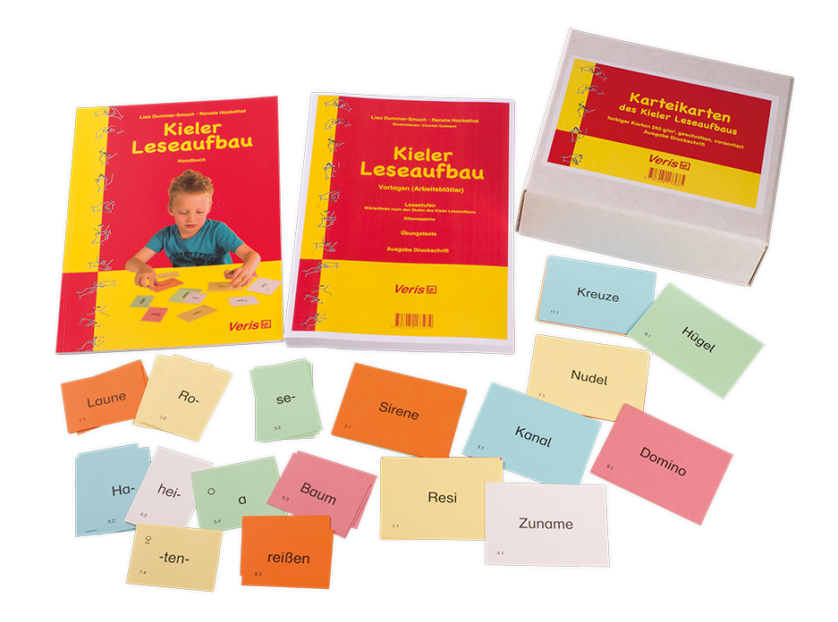 Der Kieler Leseaufbau ist ein gestufter Leselehrgang, der in kleinen Schritten vom Leichten zum Schwierigen fortschreitet. Er besteht insgesamt aus 14 Stufen. Das oberste Prinzip ist der heilpädagogische Grundsatz der Isolierung von Schwierigkeiten. Dies wird durch die konsequente Unterscheidung der Schwierigkeitsstufen im Leselernprozess gewährleistet.Die Gesamtarbeitszeit beträgt etwa 60 Stunden. Die Autorinnen entwickelten den Kieler Leseaufbau aus ihrer langjährigen Erfahrung in Förderzusammenhängen. Er ist in der Therapie von Kindern mit schweren Leselernproblemen kaum noch wegzudenken und hat längst Eingang in den Anfangsunterricht gefunden.Der Kieler Leseaufbau ist eine wichtige Hilfe im Erstleseunterricht an- Grundschulen,- Sprachheilgrundschulen und- Schulen für LernbehinderteDas Material eignet sich ebenfalls hervorragend für- Förderkurse weiterführender Schulen,- die inner- wie außerschulische Legasthenie-Therapie und- Alphabetisierungskurse.- die Arbeit mit erwachsenen Analphabeten.Der Kieler Leseaufbau unterscheidet sich von anderen Leselehrgängen und Fibelwerken dadurch, dass Schwierigkeitsstufen konsequent unterschieden werden - das Leichte wird zuerst gelernt, dann erst das Schwierige.Der Kieler Leseaufbau baut die Lesefähigkeit auf wie ein Haus - Stein für Stein, Element für Element:1. Vokale und Konsonanten in drei Schwierigkeitsstufen:- leicht hörbare Laute: lange Vokale und dehnbare Konsonanten- nicht dehnbare Konsonanten (vor allem Verschlusslaute)- alle übrigen Laute2. Das Wortmaterial ist lautgetreu:Jeder Laut entspricht einem Buchstaben. Die Vokale sind bis Stufe 11 in der Regel lang. Das kurze -e in Endungen bildet eine Ausnahme; -en, -er und -el werden jeweils als ein Laut eingeführt.3. Schwierigkeitsstufen in der Wortstruktur werden konsequent beachtet. Die Stufen 1-10 behandeln einfach strukturierte Wörter:KVK = Konsonant - langer Vokal - KonsonantKvK = Konsonant - kurzer Vokal - Konsonant- KV KvK: RO SEN, MA LER, HA FEN- KV KV KvK: TO MA TEN, TE LE FON- KVV KvK: REI SEN, TAU BENStufe 11 enthält schon Konsonantenhäufungen am Wortanfang:- KKV KvK: FRA GEN, BLU MENDie Stufe 12 zeigt Konsonantenhäufungen in der Wortmitte:- KvK KvK: WOL KEN, BIR NEN (noch ohne Dopplung)In den Stufen 13 - 14 wird geübt und vertieft. Sie enthalten Gegenüberstellungen (z.B. Frost - Forst) und lange Wörter (z.B. Nebelscheinwerfer)4. Lautgebärden unterstützen den Leselernprozess im Kieler Leseaufbau:- Unterstützung durch Bewegung und Bild- körperliche, visuelle und emotionale Verankerung- akustisch-sprechmotorische Impulse5. Prinzipiell wird lautiert statt buchstabiert.6. Schreibungen, die nur durch Regelwissen zu lösen sind, bleiben noch ausgeklammert.Das reichhaltige Übungsmaterial besteht aus denVorlagen:- 35 Wörterlisten mit ca. 30 - 50 Wörtern pro Liste- 7 gestaffelte Silbenteppiche (für die Silbenteppiche besteht Kopierverbot), sie sind auch als Silbenteppich 5er-Pack und Silbenteppich 20er-Pack erhältlich- 49 Übungstexte zum Lesen und Diktieren in verschiedenen Schwierigkeitsgradenund einer Wörter- und Spielekarteimit 1560 Karten (520 Wörterkarten DIN A7 und 1040 Spielekarten DIN A8)Viele verschiedene Spiele, die mit den Spielekarten gespielt werden können (z. B. Memory- und Quartettvarianten) sind im Handbuch beschrieben.Der Unterschied der beiden Gesamtausgaben C und D des Kieler Lesaufbaus liegt in der Darbietung der Wörter- und Spielekartei:Ausgabe C: Die Wörter- und Spielekartei wird im DIN A4 Format auf 160 g/m2-Karton in ungeschnittener Form angeboten. Sie kann vor dem Zerschneiden der einzelnen Karten laminiert werden.Ausgabe D: Die Wörter- und Spielekartei wird auf stärkerem Karton (250 g/m2), geschnitten und vorsortiert in einem separaten Karton angeboten. Die Arbeit kann direkt beginnen, man erspart sich das Zerschneiden der 1560 einzelnen Karten.Inhaltlich sind beide Ausgaben identisch.Der Kieler Rechtschreibaufbau schließt didaktisch an den Kie