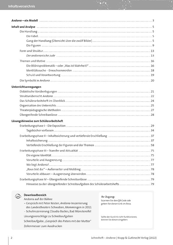 Die Macht des Vorurteils Der junge Andri ist in dem Glauben auf-gewachsen, er sei der jüdische Pflegesohn des Lehrers Can. Tatsächlich ist er aber dessen leiblicher Sohn mit einer Schwarzen aus dem Nachbarland, in dem Juden verfolgt werden und vor dem die Andorraner sich fürchten.Selbst haben sie aber auch Vorurteile gegenüber Juden und behandeln Andri nach diesem vorgefassten Bild, was auch seine Selbstwahrnehmung beeinflusst.Das Stück spielt in einer nicht näher bestimmten Zeit in Andorra, gemeint ist natürlich nicht der wirkliche Kleinstaat dieses Namens [...] Andorra ist der Name für ein Modell.« (Max Frisch). Ein Modell, das stellvertretend für jedes Land stehen kann und als Andeutung auf die Rolle der Bevölkerung während des nationalsozialistischen Regimes verstanden werden kann.Die Themen des Stücks sind aktuell wie eh und je. Mit diesem Werk gelingt eine Auseinandersetzung mit dem eigenen Denken und Handeln, Vorurteilen und der Menschenwürde, die unserem Grundgesetz ihren Halt gibt. Besonders beim Perspektivwechsel wird den Schülerinnen und Schülern die Möglichkeit gegeben, Sichtweisen zu diskutieren. Dieses Material ermöglicht, sich fundiert zu äußern, kritisch und ehrlich zu argumentieren und selbst zu reifen.Das Lehrerheft enthält:- ausführliche, kommentierte Inhaltsangabe- Analyse von Figuren, Themen und Symbolik- Lösungen zum Schülerarbeitsheft- Anregungen zur Unterrichtsgestaltung- theaterpädagogische Methoden- Schreibanlässe- Transfer und AktualitätDas unter ISBN: 978-3-941206-64-9 separat erhältliche Schülerarbeitsheft enthält:-Erschließung der Handlung-Inhaltssicherung-Symbolik-Identitätsfindung-Schreibaufgaben (Rede, innerer Monolog, Anklageschrift ...)-abwechslungsreiche Aufgabenformate-Strukturbilder-transferierbare Methoden und Arbeitstechniken-Infomaterialien: Antisemitismus, Strafrecht, Ausgrenzung, Ausländerfeindlichkeit