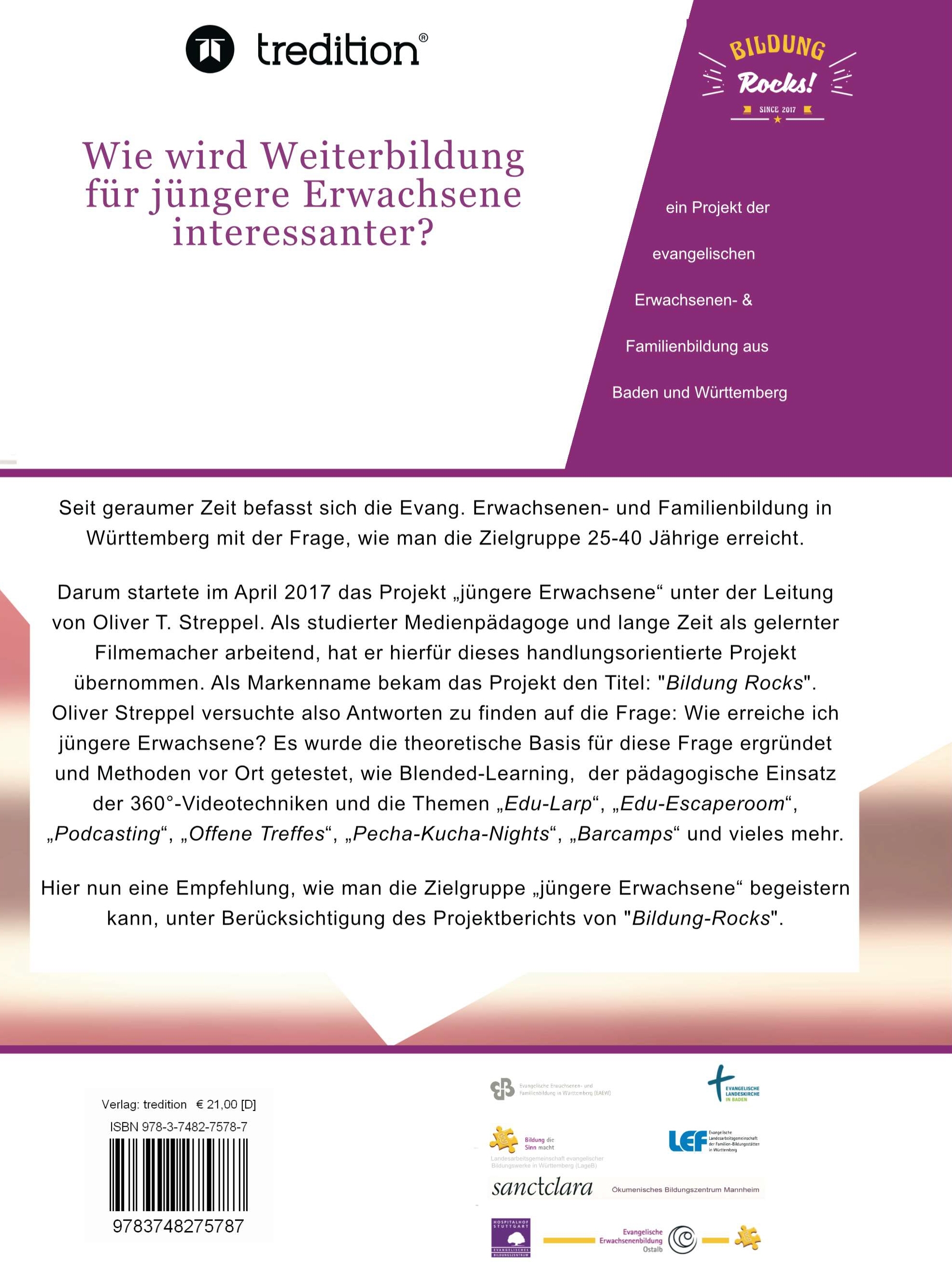 Seit geraumer Zeit befasst sich die Evang. Erwachsenen- und Familienbildung in Württemberg mit der Frage, wie man die Zielgruppe 25-40 Jährige erreicht. Darum startete im April 2017 das Projekt "jüngere Erwachsene" unter der Leitung von Oliver T. Streppel. Als studierter Medienpädagoge und lange Zeit als gelernter Filmemacher arbeitend, hat er hierfür dieses handlungsorientierte Projekt übernommen. Als Markenname bekam das Projekt den Titel: "Bildung Rocks". Oliver Streppel versuchte also Antworten zu finden auf die Frage: Wie erreiche ich jüngere Erwachsene? Es wurde die theoretische Basis für diese Frage ergründet und Methoden vor Ort getestet, wie Blended-Learning, der pädagogische Einsatz der 360°-Videotechniken und die Themen "Edu-Larp", "Edu-Escaperoom", "Podcasting", "Offene Treffes", "Pecha-Kucha-Nights", "Barcamps" und vieles mehr. Hier nun eine Empfehlung, wie man die Zielgruppe "jüngere Erwachsene" begeistern kann, unter Berücksichtigung des Projektberichts von "Bildung-Rocks".