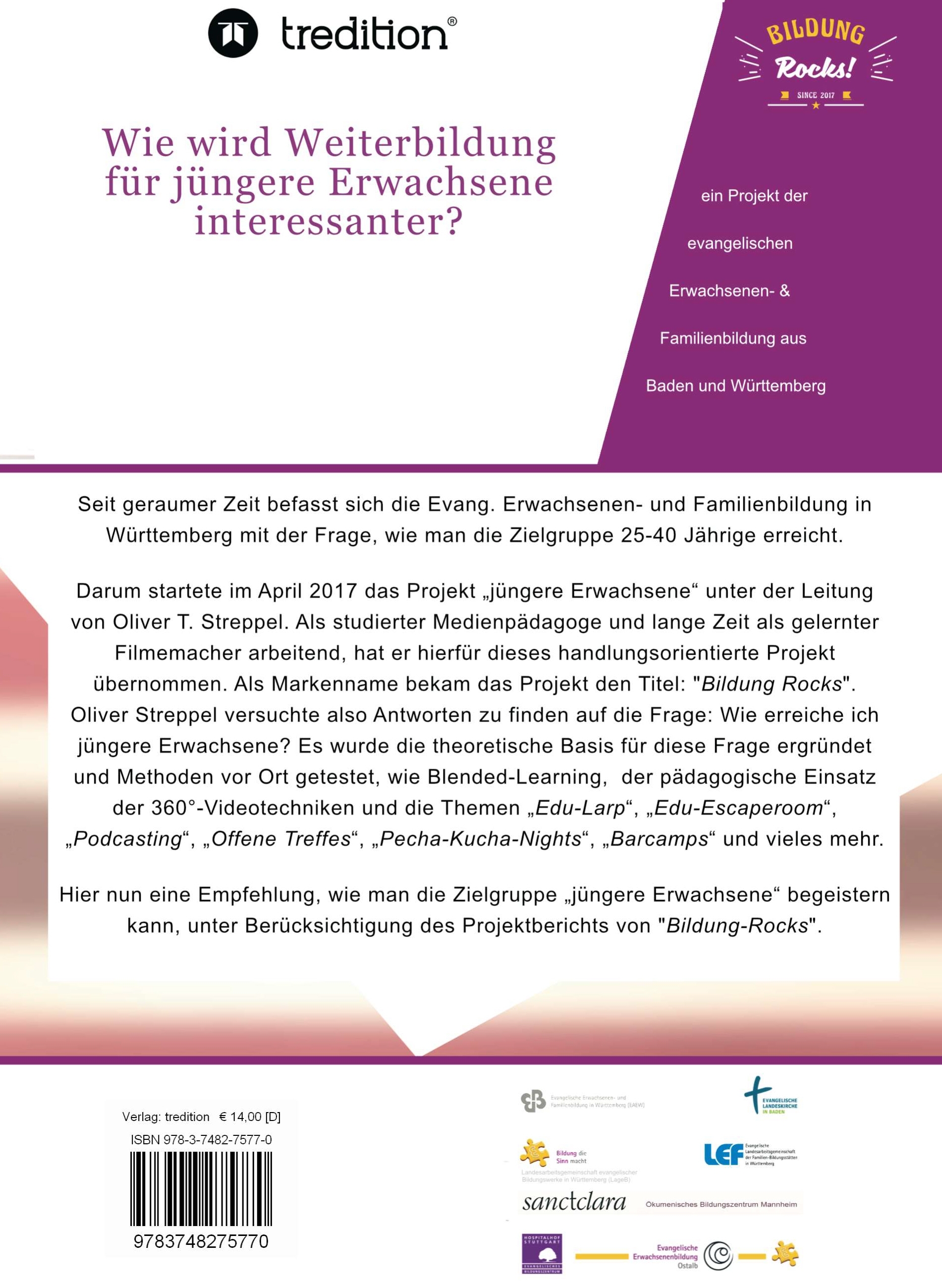 Seit geraumer Zeit befasst sich die Evang. Erwachsenen- und Familienbildung in Württemberg mit der Frage, wie man die Zielgruppe 25-40 Jährige erreicht. Darum startete im April 2017 das Projekt "jüngere Erwachsene" unter der Leitung von Oliver T. Streppel. Als studierter Medienpädagoge und lange Zeit als gelernter Filmemacher arbeitend, hat er hierfür dieses handlungsorientierte Projekt übernommen. Als Markenname bekam das Projekt den Titel: "Bildung Rocks". Oliver Streppel versuchte also Antworten zu finden auf die Frage: Wie erreiche ich jüngere Erwachsene? Es wurde die theoretische Basis für diese Frage ergründet und Methoden vor Ort getestet, wie Blended-Learning, der pädagogische Einsatz der 360°-Videotechniken und die Themen "Edu-Larp", "Edu-Escaperoom", "Podcasting", "Offene Treffes", "Pecha-Kucha-Nights", "Barcamps" und vieles mehr. Hier nun eine Empfehlung, wie man die Zielgruppe "jüngere Erwachsene" begeistern kann, unter Berücksichtigung des Projektberichts von "Bildung-Rocks".