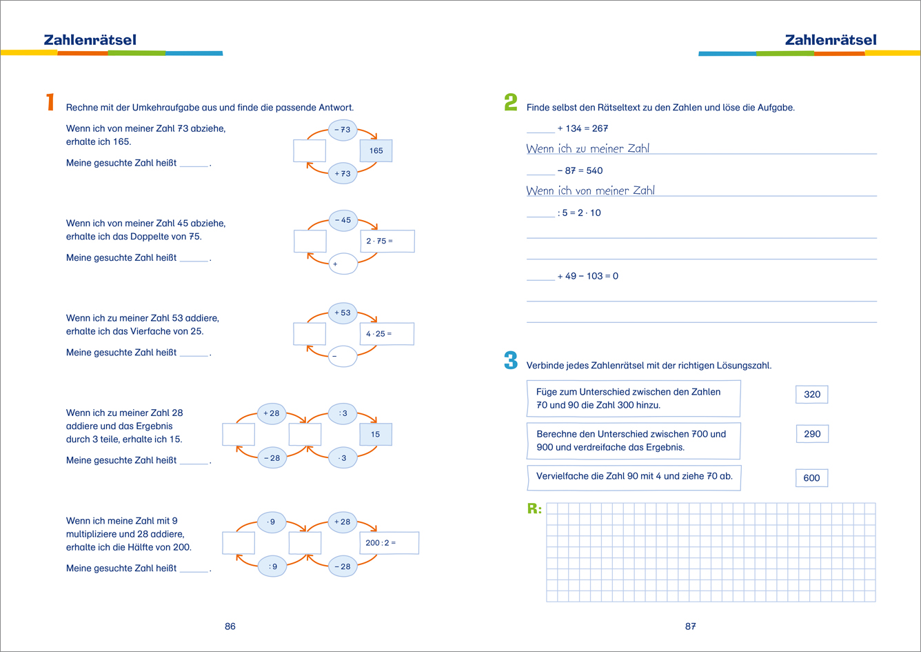 Dieser preiswerte Sammelband enthält die wichtigen Themen schriftlich rechnen und Textaufgaben. Der erste Teil des Buches hilft Kindern in der 3. Klasse, fit im schriftlichen Addieren und Subtrahieren zu werden. Schritt für Schritt wird erklärt, wie Zahlenwerte und Überträge notiert und Ergebnisse ermittelt werden, bevor Addition und Subtraktion in vielen abwechslungsreichen Aufgaben zur Anwendung kommen. Worauf es beim Lösen von Textaufgaben ankommt, etwa das genaue Lesen der Aufgabe oder das Erkennen von Rechenwörtern und wichtigen Angaben, vermittelt der zweite Teil des Buches. Die gegebenen Tipps und Tricks werden anschließend in zahlreichen, vielfältigen Textaufgaben gefestigt. Ob die kleinen Rechenkünstler alle Aufgaben richtig gelöst haben, erfahren sie im Lösungsteil am Ende des Heftes.
