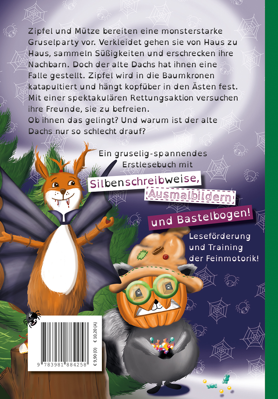 Zipfel und Mütze bereiten eine monsterstarke Gruselparty vor.Verkleidet gehen sie von Haus zu Haus, sammeln Süßigkeiten und erschrecken ihre Nachbarn. Doch der alte Dachs hat ihnen eine Falle gestellt. Zipfel wird in die Baumkronen katapultiert und hängt kopfüber in den Ästen fest. Mit einer spektakulären Rettungsaktion versuchen ihre Freunde, sie zu befreien. Ob ihnen das gelingt? Und warum ist der alte Dachs nur so schlecht drauf?Ein spannendes Erstlesebuch in Silbenschreibweise, mit Bastelbogen und Ausmalbildern.Leseförderung und Training der Feinmotorik