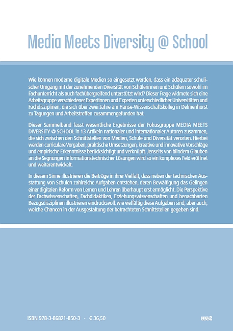 | Schlagworte | Calliope Mini • Digitale Medien • Digitalkompetenz • Diversität, Diversity • EFL-Klassenzimmer • Inklusion • KMK-Strategie • MEDIA MEETS DIVERSITY @ SCHOOL MEDIA MEETS DIVERSI • MEDIA MEETS DIVERSITY @ SCHOOL MEDIA MEETS DIVERSITY @ SCHOOL • Mediendidaktik |