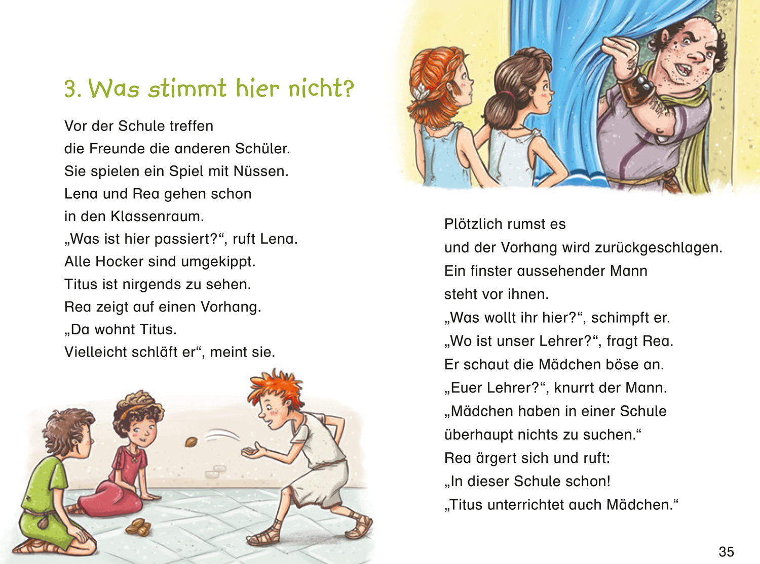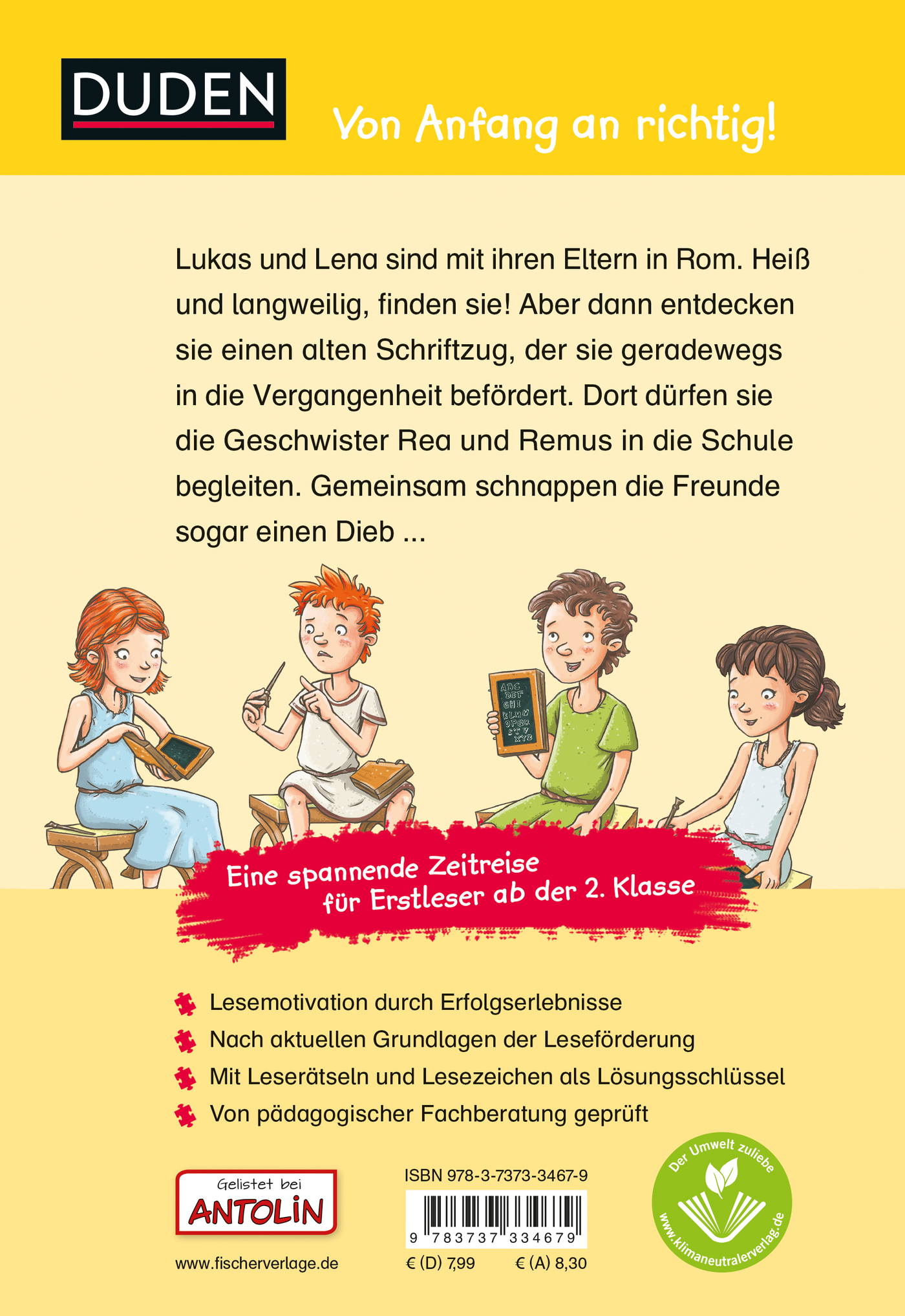 Lukas und Lena schlappen hinter ihren Eltern durch Rom. Heiß und langweilig, finden sie. Bis sie durch einen geheimnisvollen Schriftzug am Forum Romanum in die Vergangenheit reisen! Dort dürfen sie den Alltag der Geschwister Rea und Remus in der Antike, zwischen Schule, Speisesaal und Therme, kennenlernen. Sogar einen Räuber müssen die Kinder fangen, um ihren Lehrer Titus zu befreien! Ist doch irgendwie ganz schön spannend, das alte Rom ...