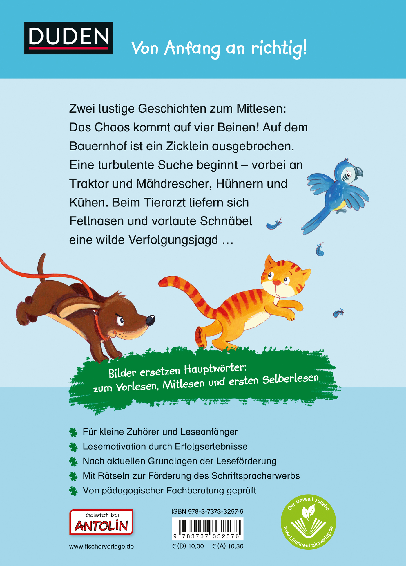 Zwei lustige Geschichten zum Vorlesen und Mitlesen in einem Band! Auf dem Bauernhof ist ein Zicklein ausgebrochen. Eine turbulente Suche beginnt, vorbei an Traktor und Mähdrescher, Hühnern und Kühen. Beim Tierarzt dagegen liefern sich Hund, Katze und Papagei eine wilde Verfolgungsjagd ... Hier kommen alle kleinen Tierfreunde voll auf ihre Kosten.