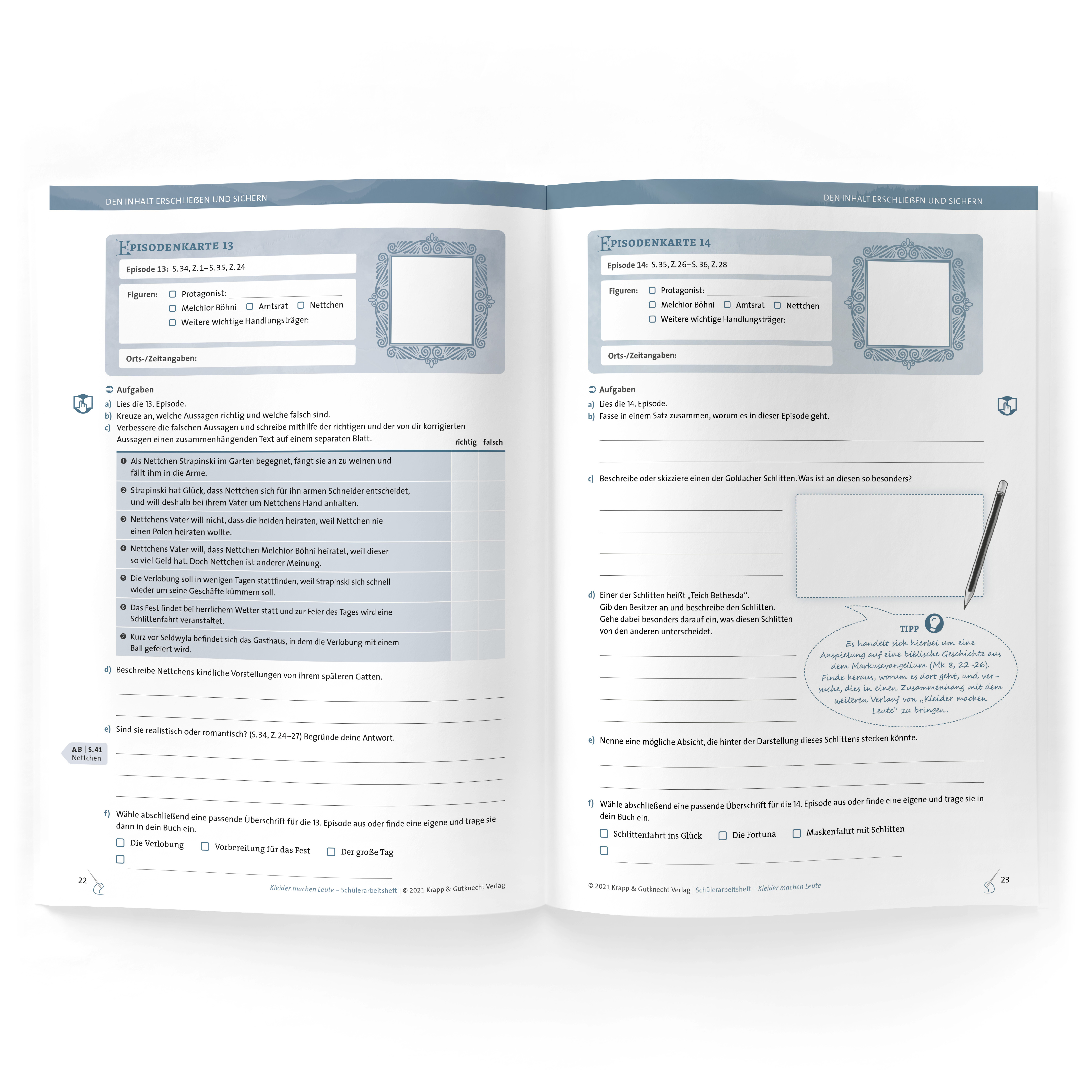 - Inhaltssicherung - Untersuchung der Handlungsentwicklung - Figuren: Charakteristik und Entwicklung - Eindrücke und Gedanken während der Lektüre - Vertiefung der Themen der Novelle- Informationen zur Entstehung - stilistische und sprachliche Gestaltungsmittel- Schreibanlässe und Schreibaufgaben- Aufgaben im Stil der Abschlussprüfung + Hörtexte und digitale Aufgaben(Die Seitenangaben beziehen sich auf folgende Textausgabe: Gottfried Keller - Kleider machen Leute, DIN A5, 72 Seiten, Krapp & Gutknecht Verlag, ISBN 978-3-96323-037-0, Bestell-Nr. TBKleider) Ergänzend zu dem Schülerarbeitsheft empfehlen wir das Trainingsbuch "Sicher zum Realschulabschluss Deutsch Ba-Wü 2022". Zu finden unter der ISBN: 978-3-96323-038-7, Bestell-Nr. S3038.Zur Bearbeitung der Lektüre auf G-Niveau finden Sie unter der ISBN: 978-3-96323-040-0, Bestell-Nr. S3040 ein ausführliches Trainingsbuch, das neben dieser Lektüre auch auf alle weiteren Prüfungsformate des Hauptschulabschlusses vorbereitet.