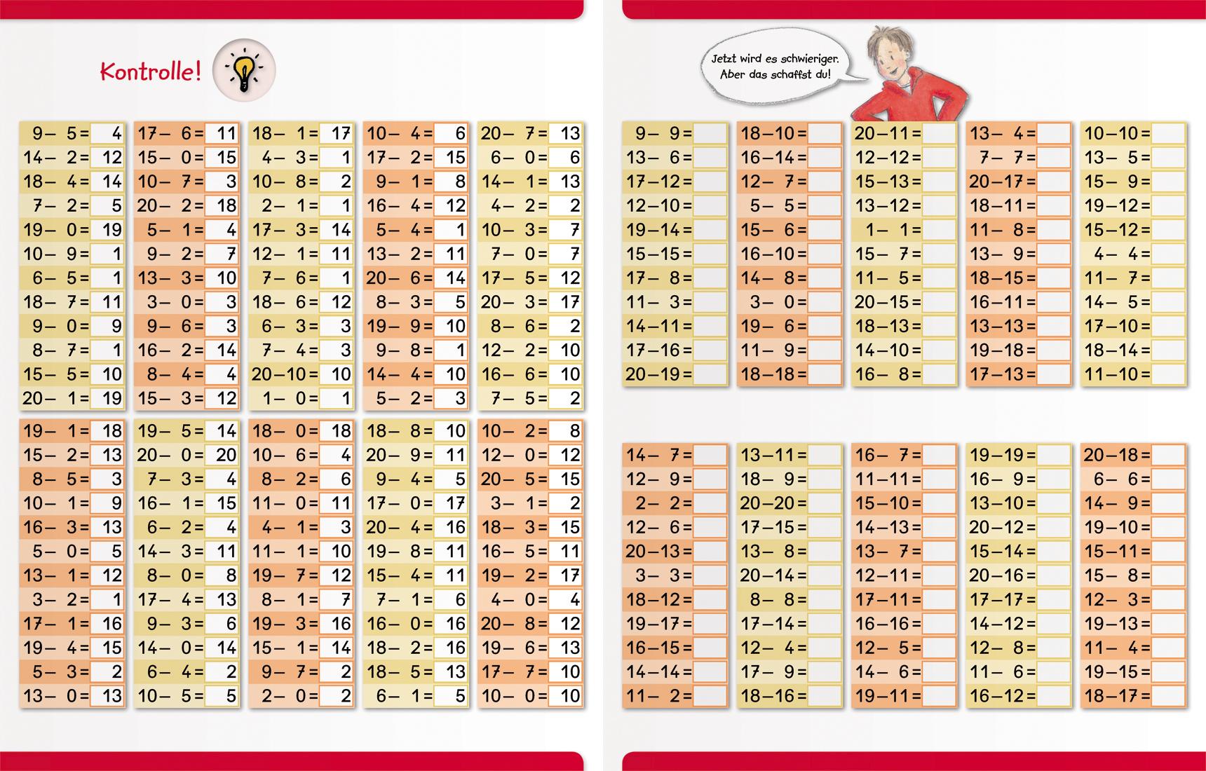 Ich übe alle Subtraktionsaufgaben im Zahlenraum bis 20 mit Stift