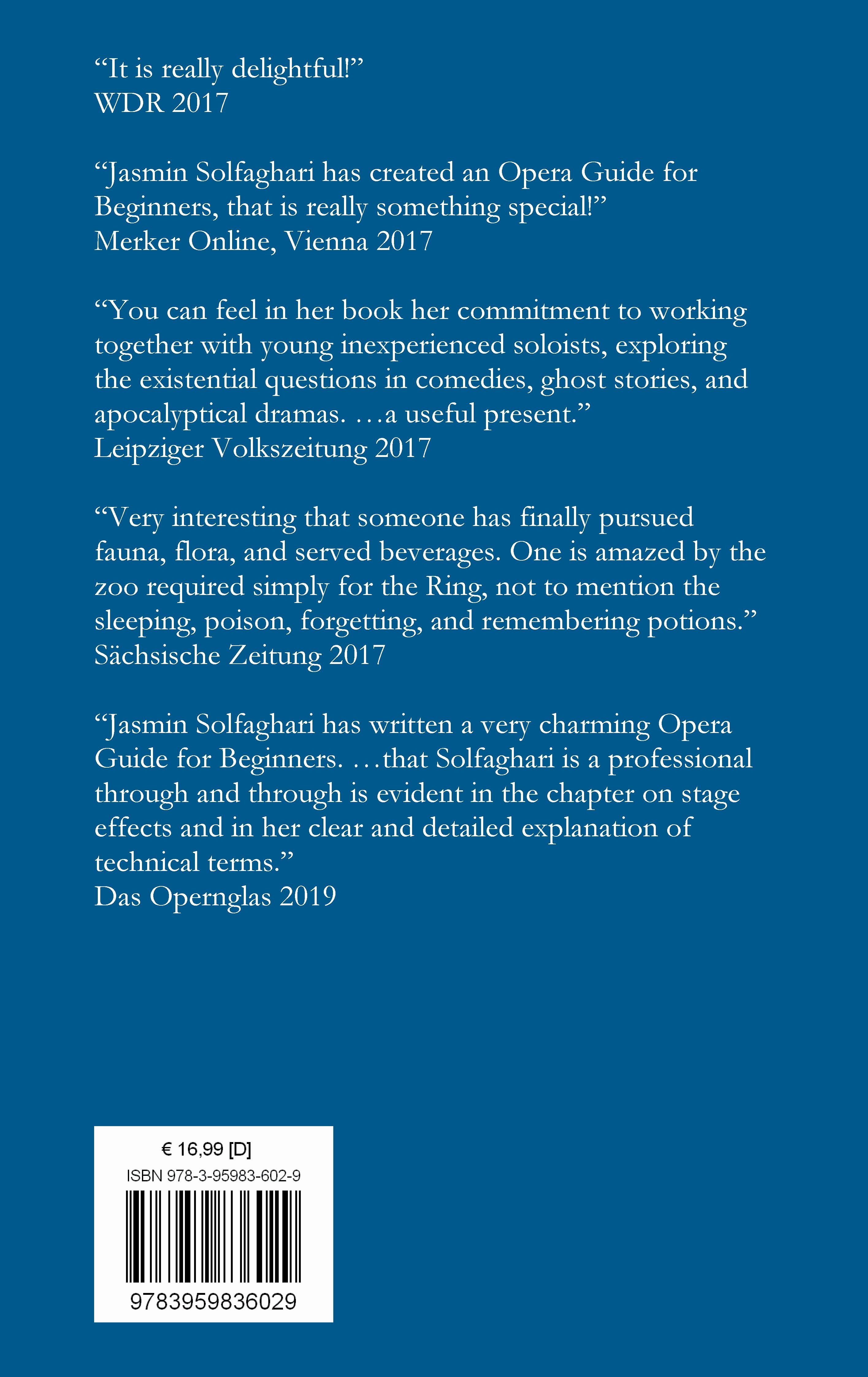 Opera director Jasmin Solfaghari has written a very special kind of opera guide. Three milestones of the opera literature are explained by the narrator "LUNA of the moon" in a most skillful way: "The Marriage of Figaro", "The Freeshooter", and "The Ring of the Nibelung". In the second chapter, LUNA takes the reader backstage and spreads a little light on many secrets of the theater. Finally in chapter three, in order to understand and enjoy the operas more fully, LUNA explains many of the German words from "The Freeshooter" and "The Ring of the Nibelung" not always found in a normal dictionary. The "Opera Guide for Beginners" is available in hardcover, paperback, or as an e-book. Let yourself be carried off to a world of dragons, weddings, chaos, tears and unbridled passion!