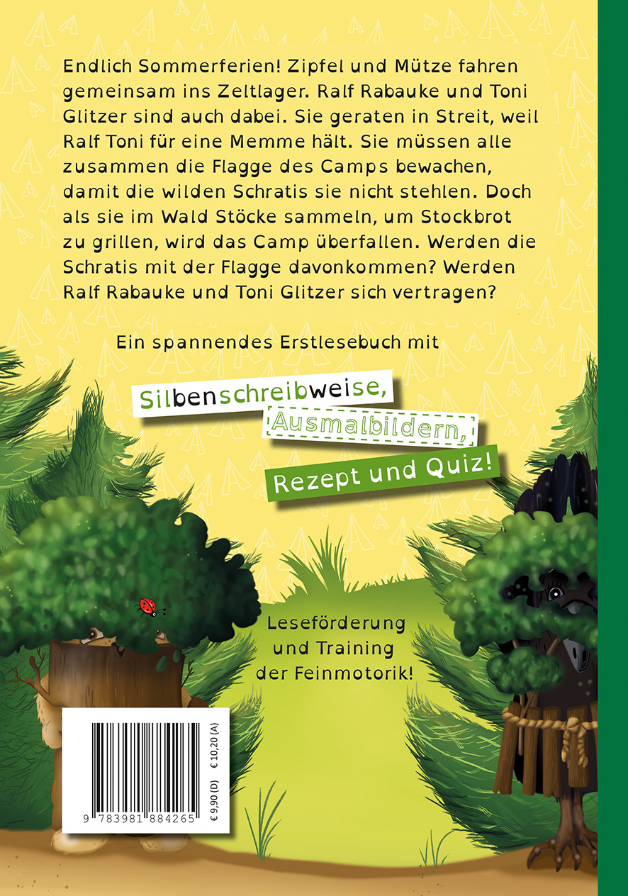 Endlich Sommerferien! Zipfel und Mütze fahren gemeinsam ins Zeltlager. Ralf Rabauke und ToniGlitzer sind auch dabei. Sie geraten in Streit, weil Ralf Toni für eine Memme hält. Sie müssen allezusammen die Flagge des Camps bewachen, damit die wilden Schratis sie nicht stehlen. Doch als sieim Wald Stöcke sammeln, um Stockbrot zu grillen, wird das Camp überfallen. Werden die Schratis mitder Flagge davonkommen? Werden Ralf Rabauke und Toni Glitzer sich vertragen?Ein spannendes Erstlesebuch in Silbenschreibweise, mit Ausmalbildern, Rezept und Wissenstest.