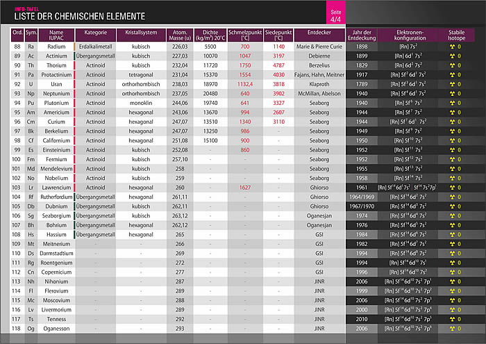 - Auflistung aller aktuell bekannten Elemente mit