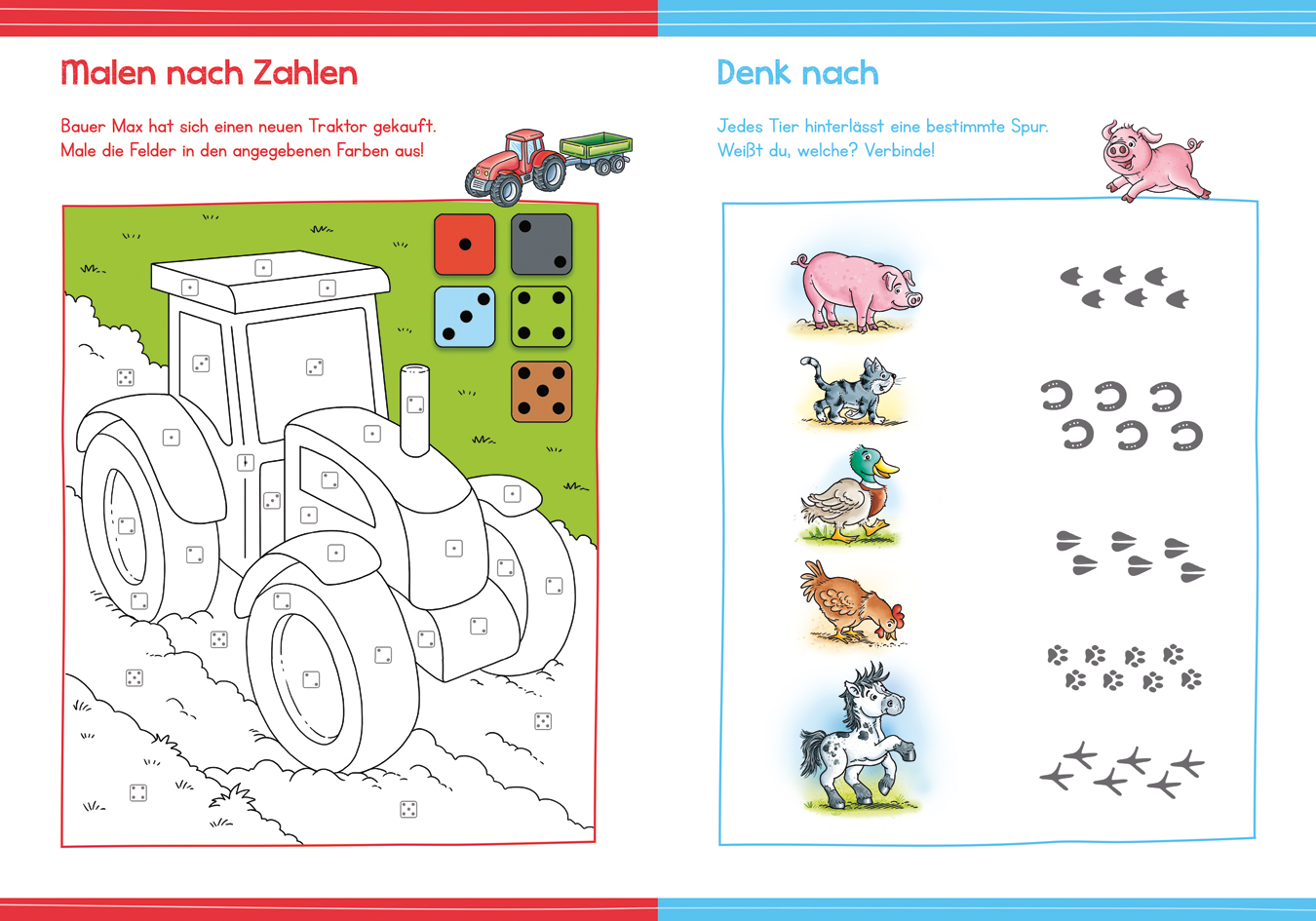 Welche Fußabdrücke gehören zu welchem Bauernhoftier? Wie findet der Traktor den Weg durch das Labyrinth am besten? Und wo verstecken sich Hund, Katze und Küken im Tiergewimmel? Viele abwechslungsreiche Rätsel zum Suchen und Finden, Zählen und Zuordnen sowie Verbinden und Nachspuren rund um den Bauernhof und seine tierischen Bewohner finden sich in diesem bunten Rätselmix. Mit den Ausmalbildern von riesigen Mähdreschern und Traktoren oder süßen Ziegen und Schafen üben die Kinder ganz nebenbei den Umgang mit Stift und Farben.