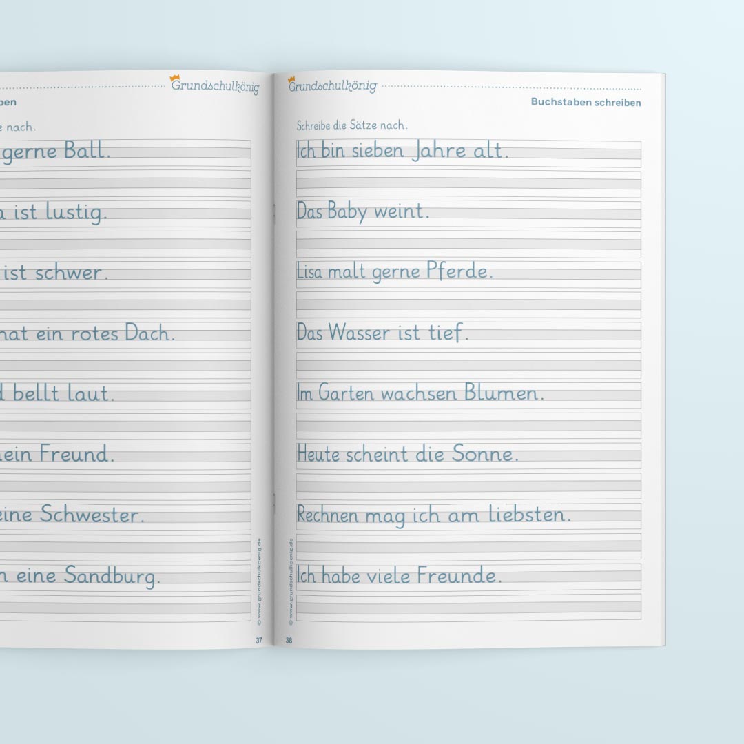 Nach dem Erlernen der Buchstaben können auf den anschließenden Trainingsseiten schon ganze Wörter (8 Seiten) sowie schließlich ganze Sätze (2 Seiten) geschrieben und geübt werden.