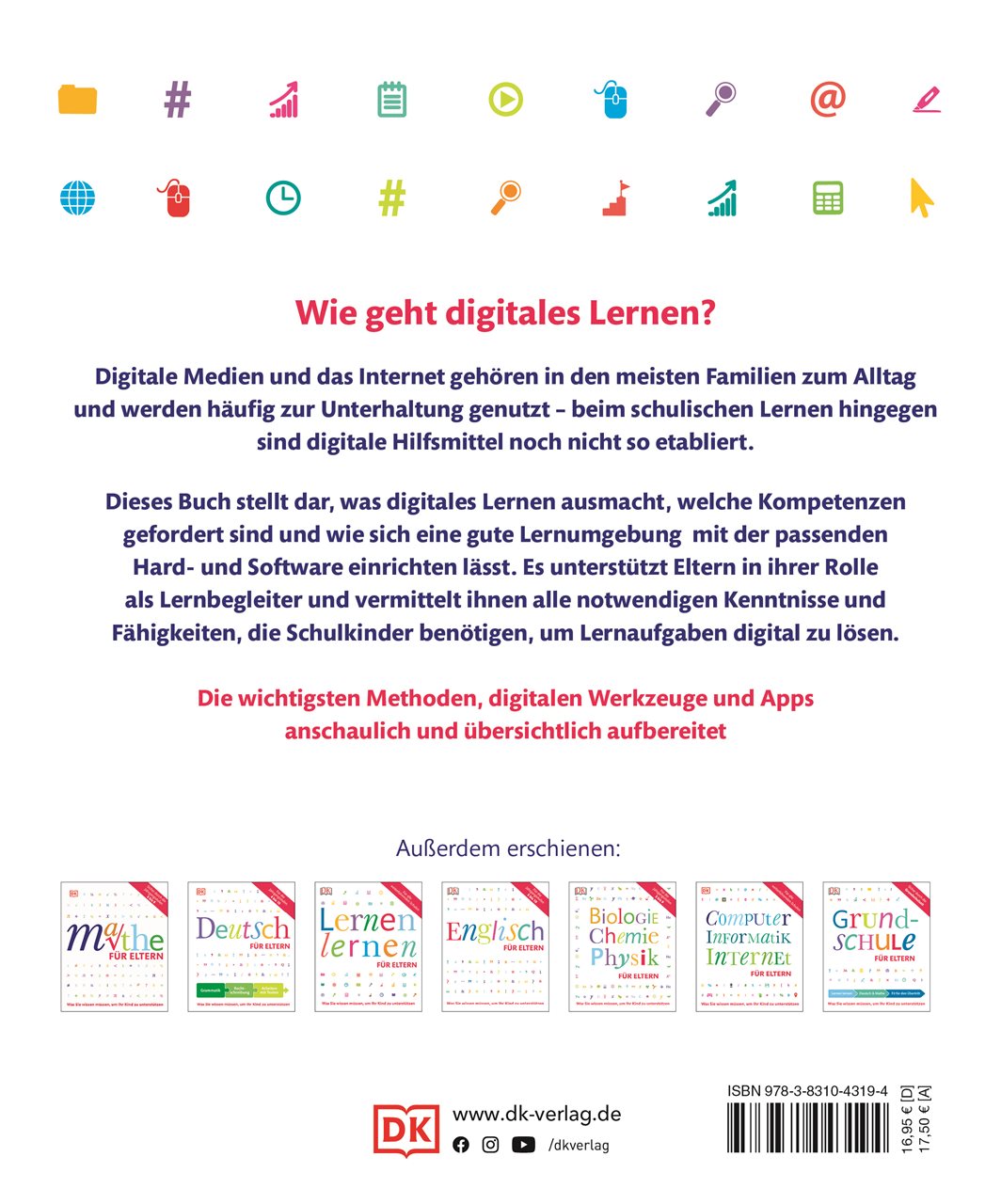 Bei der aktuellen Fülle an digitalen Lernmethoden und -möglichkeiten blicken Sie nicht mehr durch? Dieser Lernratgeber aus der beliebten DK Reihe "... für Eltern" unterstützt Sie und Ihre Kinder beim Online-Lernen und erfolgreichen Umgang mit digitalen Geräten und Medien. Ob Inhalte planen und strukturieren oder Zusammenhänge herstellen - hier erhalten Sie einen fundierten Überblick über nützliche digitale Werkzeuge und Online-Angebote.