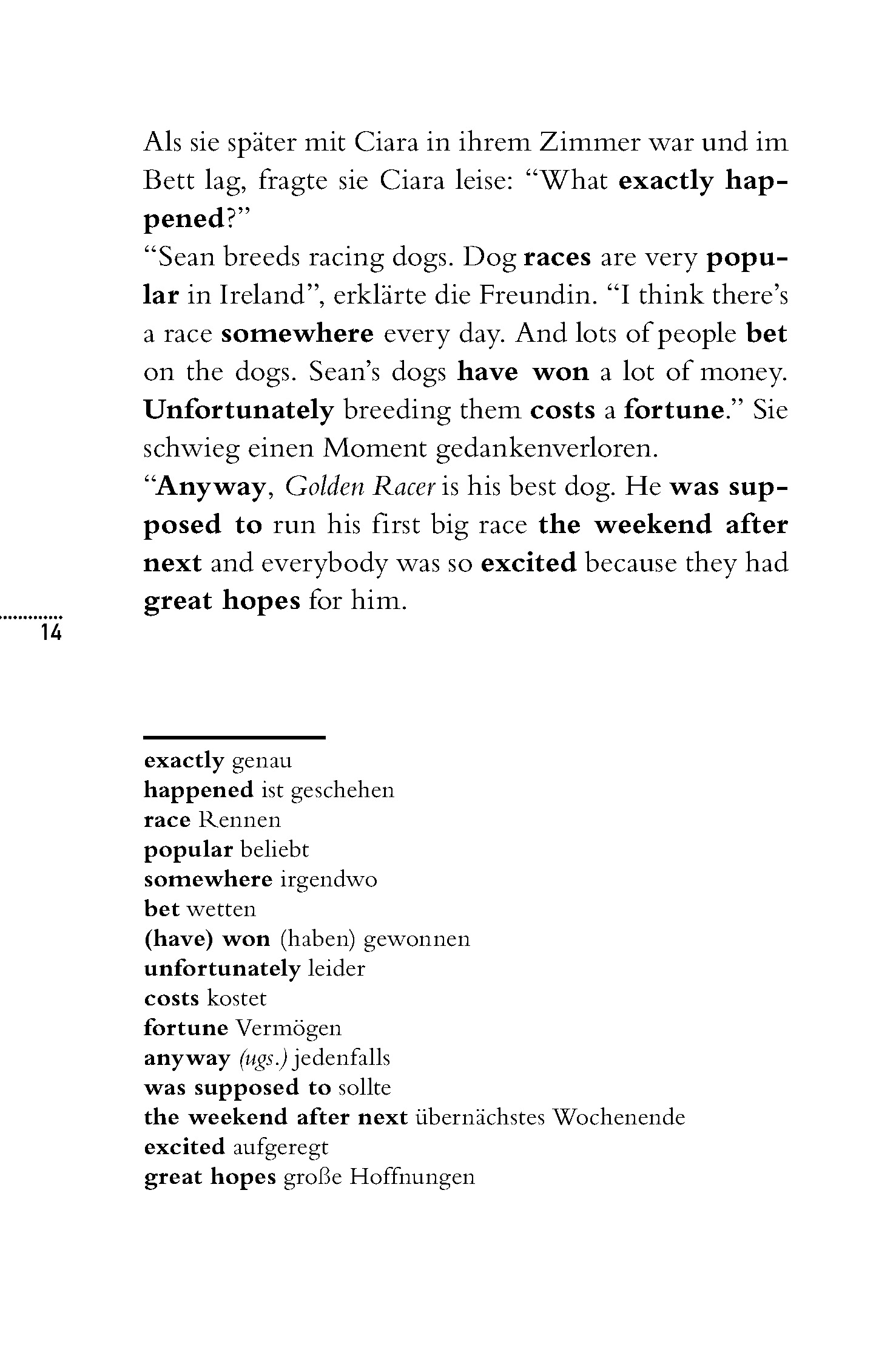 Britta besucht zusammen mit ihrer neuen Freundin Ciara deren Onkel und Tante in Muckross. Eines Abends herrscht helle Aufregung: Uncle Seans Golden Racer, sein wertvollster Rennhund, ist gestohlen worden! Werden Britta und Ciara ihn wohlbehalten wieder finden? Ein Buch über eine abenteuerliche Suche, falsche Verdächtigungen und Freundschaft.