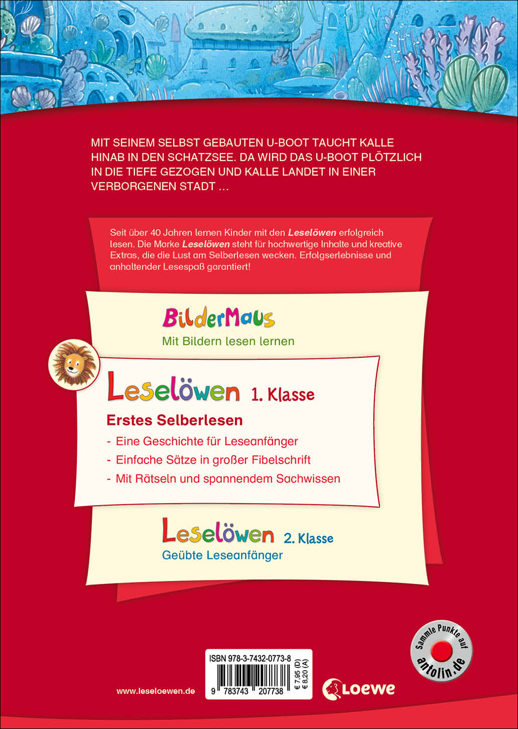 Mit seinem selbst gebauten U-Boot taucht Kalle hinab in den Schatzsee. Kann er das Geheimnis des Sees aufdecken? Plötzlich wird er von einem riesigen Kraken in die Tiefe gezogen und landet in der verborgenen Stadt von König Atlan. Mit den Leselöwen für die erste Klasse können Kinder schon ganz allein ihr erstes eigenes Buch lesen. In jedem Buch wartet eine spannende Geschichte zu einem beliebten Thema mit vielen bunten Bildern, kurzen Sätzen und kleinen Texteinheiten, die jeweils in Sinnschritte unterteilt sind. Die große Fibelschrift erleichtert das Lesenlernen und mit Rätseln und Sachwissen am Ende der Geschichte können die Kinder spielend leicht überprüfen, ob sie den Text richtig verstanden haben. So macht Lesenlernen Spaß!