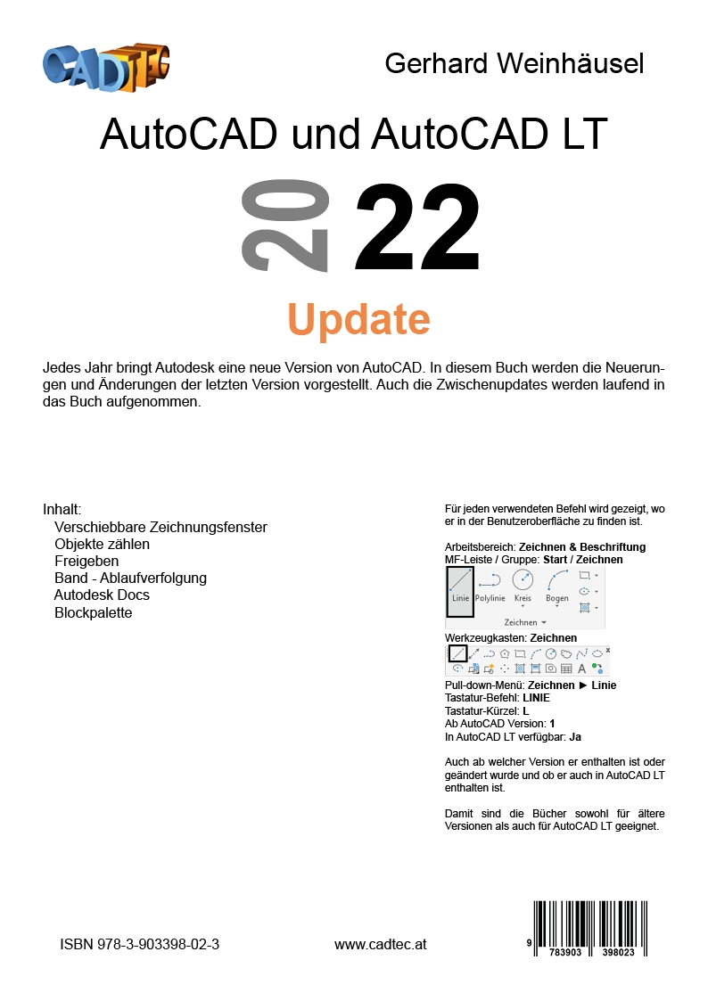 | Schlagworte | 2022 • 2D • 3D • AutoCAD • AutoCAD LT • CAD • Handbuch • Kurs • Schulung • Selbststudium • Update |