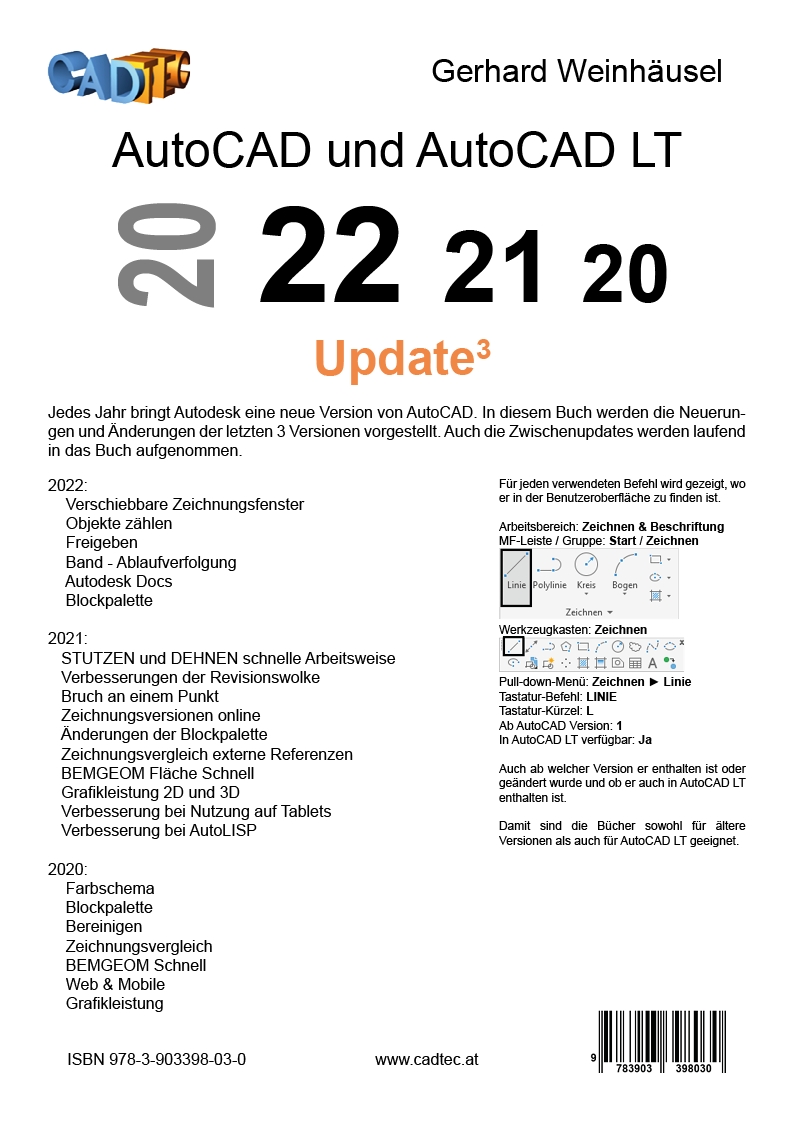 | Schlagworte | 2020 • 2021 • 2022 • 2D • 3D • AutoCAD • AutoCAD LT • CAD • Handbuch • Kurs • Schulung • Selbststudium • Update |