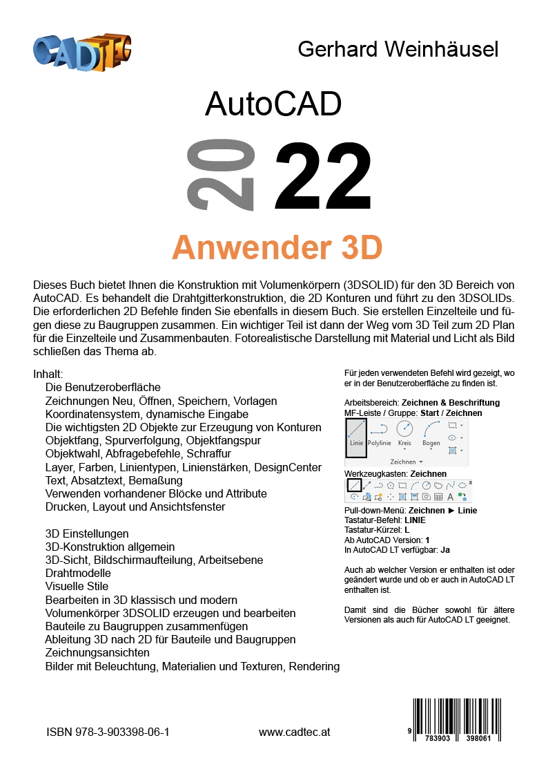 | Schlagworte | 2022 • 2D • 3D • AutoCAD • AutoCAD LT • CAD • Handbuch • Kurs • Schulung • Selbststudium |