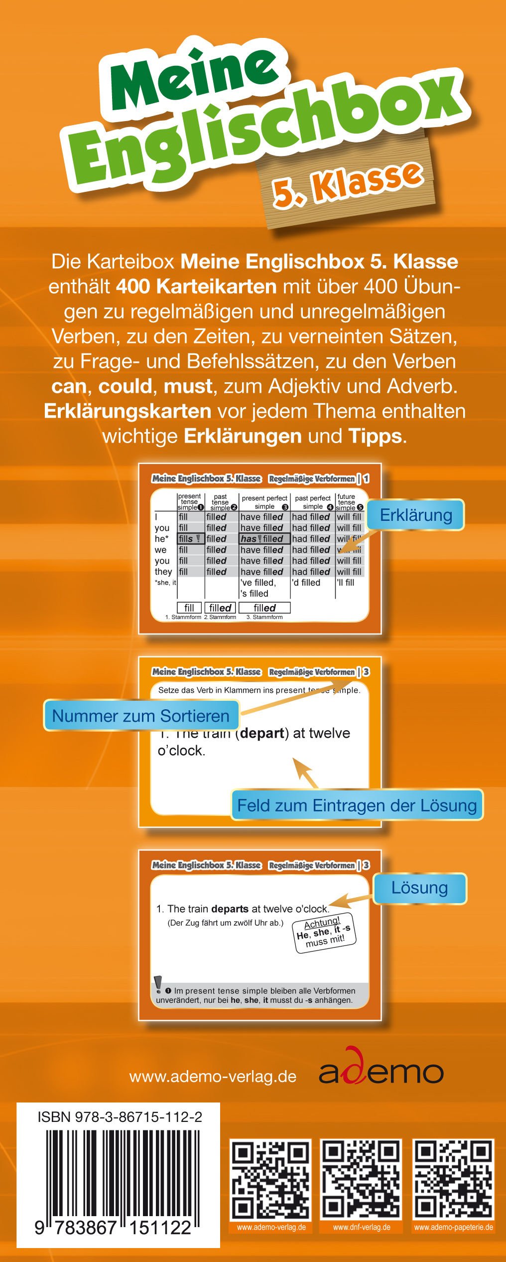 Die Karteibox Meine Englischbox 5. Klasse ist lehrbuchunabhängig und enthält 400 farbige Karteikarten mit 400 Übngsaufgaben zu regelmäßigen und unregelmäßigen Verbformen, zu den Zeiten wie present und past tense usw., zur Verneinung, zu Fragen mit und ohne Fragewort, question tags, zum Imperativ, zu den Modalverben can, could, must und zum Adjektiv und Adverb.Auf jeder Karte ist auf der Vorderseite die Übungsaufgabe und auf der Rückseite ist die richtige Lösung dargestellt.Alle Karten sind thematisch geordnet und vor jedem Thema ist eine Erklärungskarte mit wichtigen Erklärungen und Tipps gegeben.Registerkarten in jeder Box sorgen für die Selbstkontrolle.Zwei Stickerblätter mit vielen coolen Stickern bringen Spaß beim Lernen.
