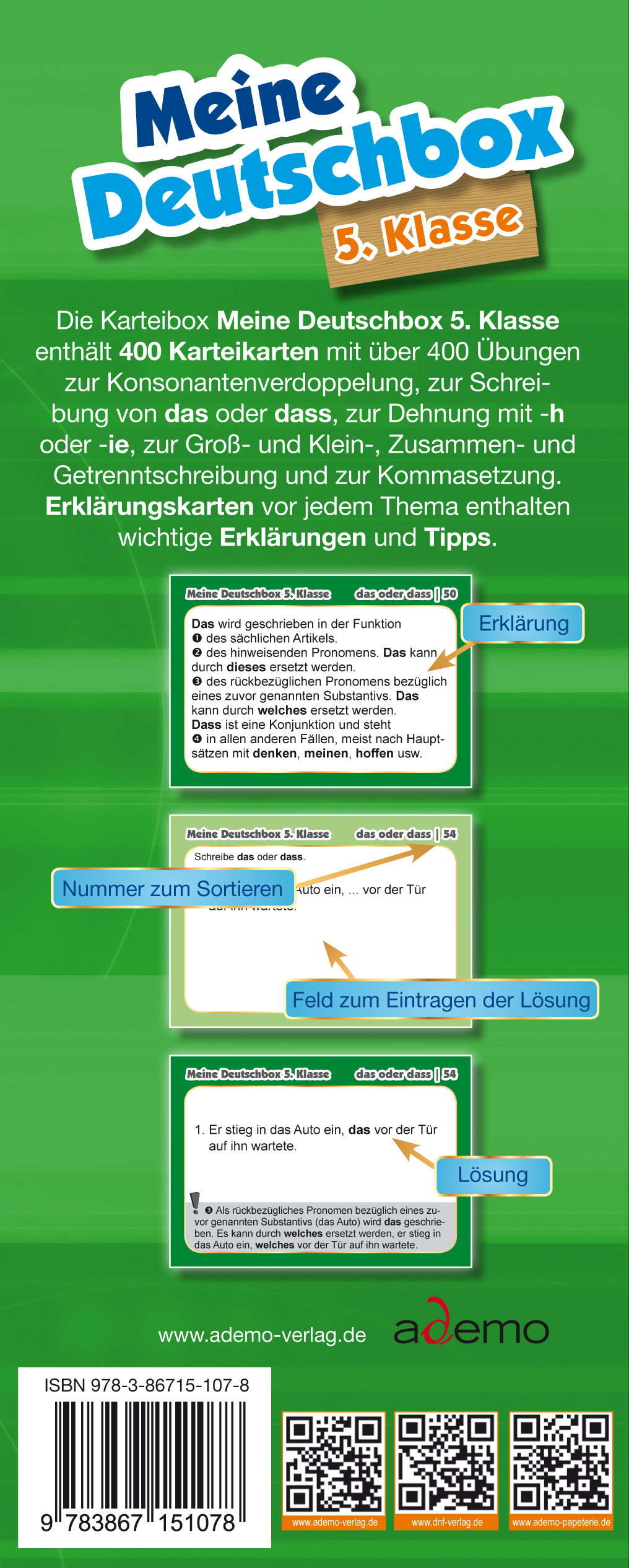 Die Karteibox Meine Deutschbox 5. Klasse ist lehrbuchunabhängig und enthält 400 farbige Karteikarten mit 400 Übungsaufgaben zur Konsonantenverdoppelung, zur Verwendung von das und dass, zur Dehnung mit -h und -ie, zur Groß und Kleinschreibung, Zusammen- und Getrenntschreibung, zur Kommasetzung.Auf jeder Karte ist auf der Vorderseite die Übungsaufgabe und auf der Rückseite ist die richtige Lösung dargestellt.Alle Karten sind thematisch geordnet und vor jedem Thema ist eine Erklärungskarte mit wichtigen Erklärungen und Tipps gegeben.Registerkarten in jeder Box sorgen für die Selbstkontrolle.Zwei Stickerblätter mit vielen coolen Stickern bringen Spaß beim Lernen.