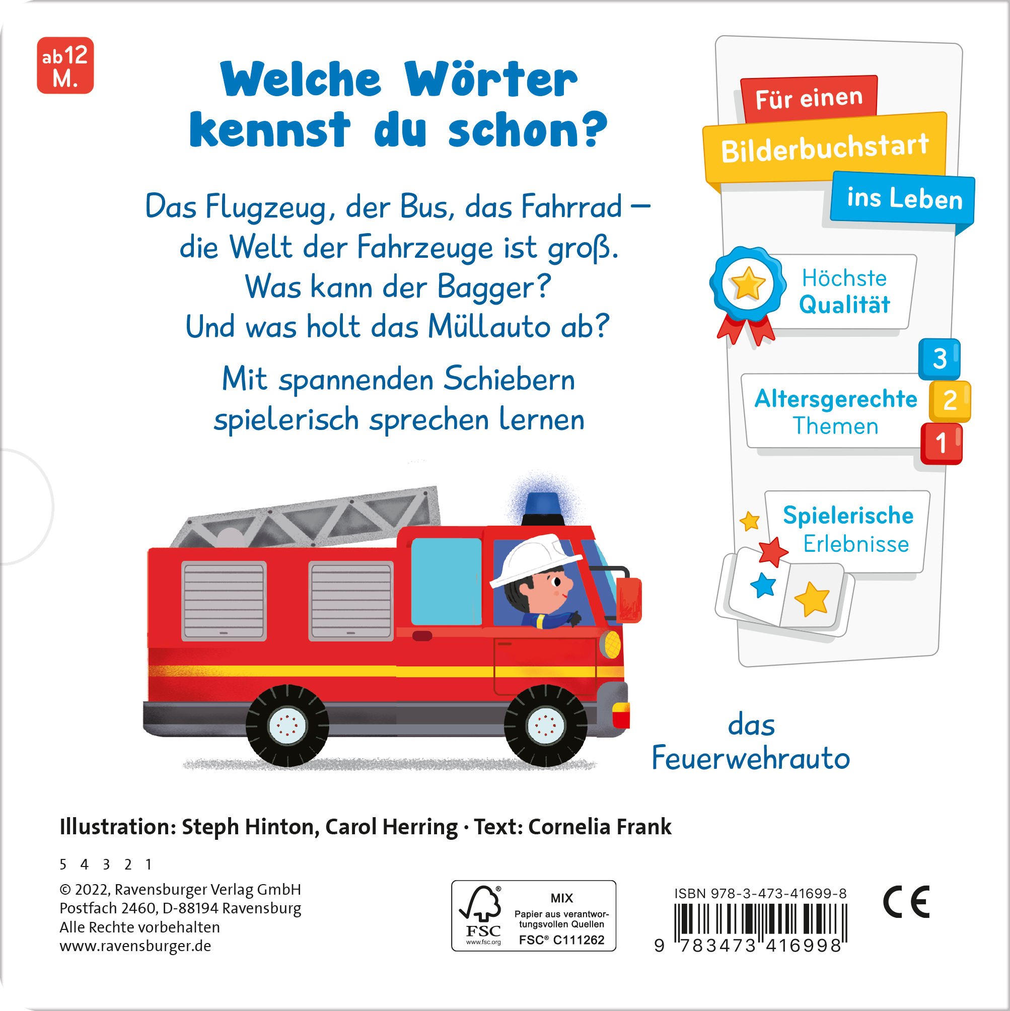 In diesem ersten Wörterbuch lernen Kinder ab 12 Monaten die ersten spannenden Fahrzeuge zu benennen. Einfache Bilder sowie lustige und spannende Schiebeeffekte helfen beim Sprechenlernen und vermitteln allererstes Sachwissen über die vielen verschiedenen Fahrzeuge.