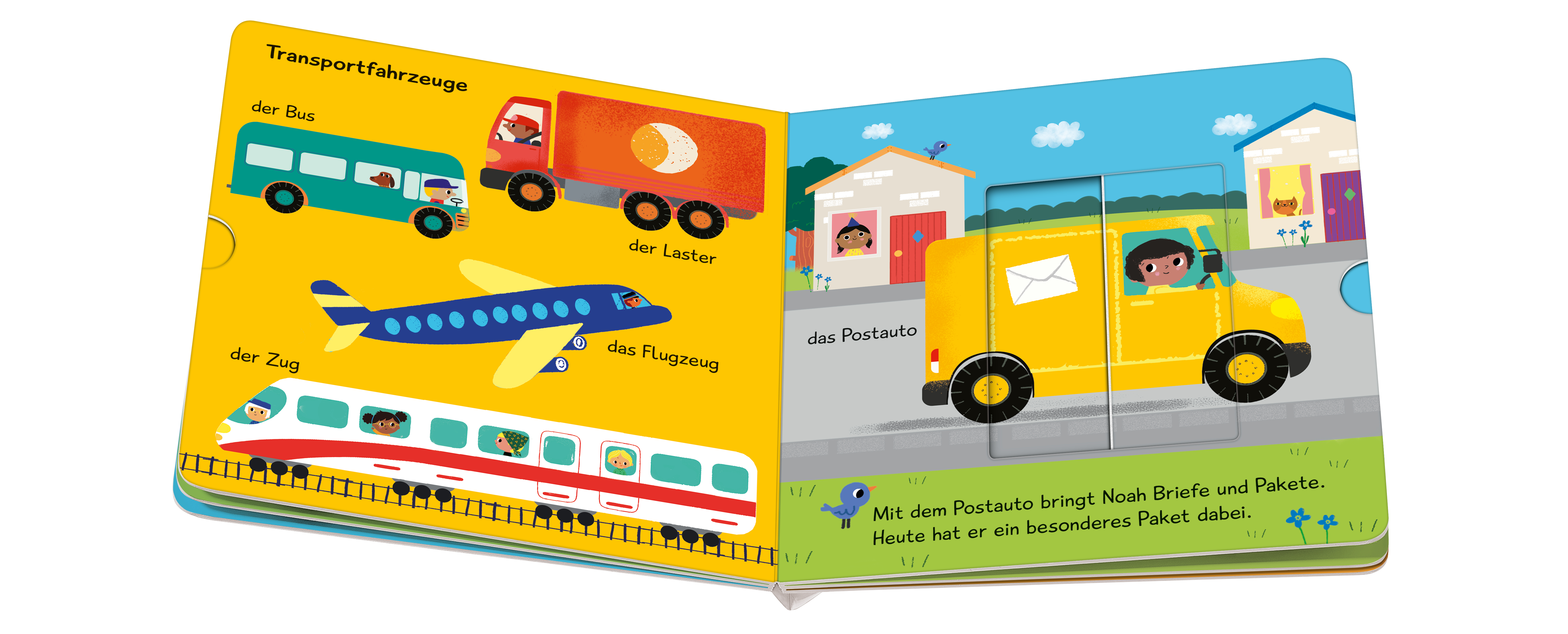 Auf jeder Doppelseite erleben Kinder ab 1 Jahr die Fahrzeuge auch in Aktion. Der Bagger hilft auf der Baustelle. Das Postauto bringt Pakete. Und die Müllabfuhr leert die Tonne aus.