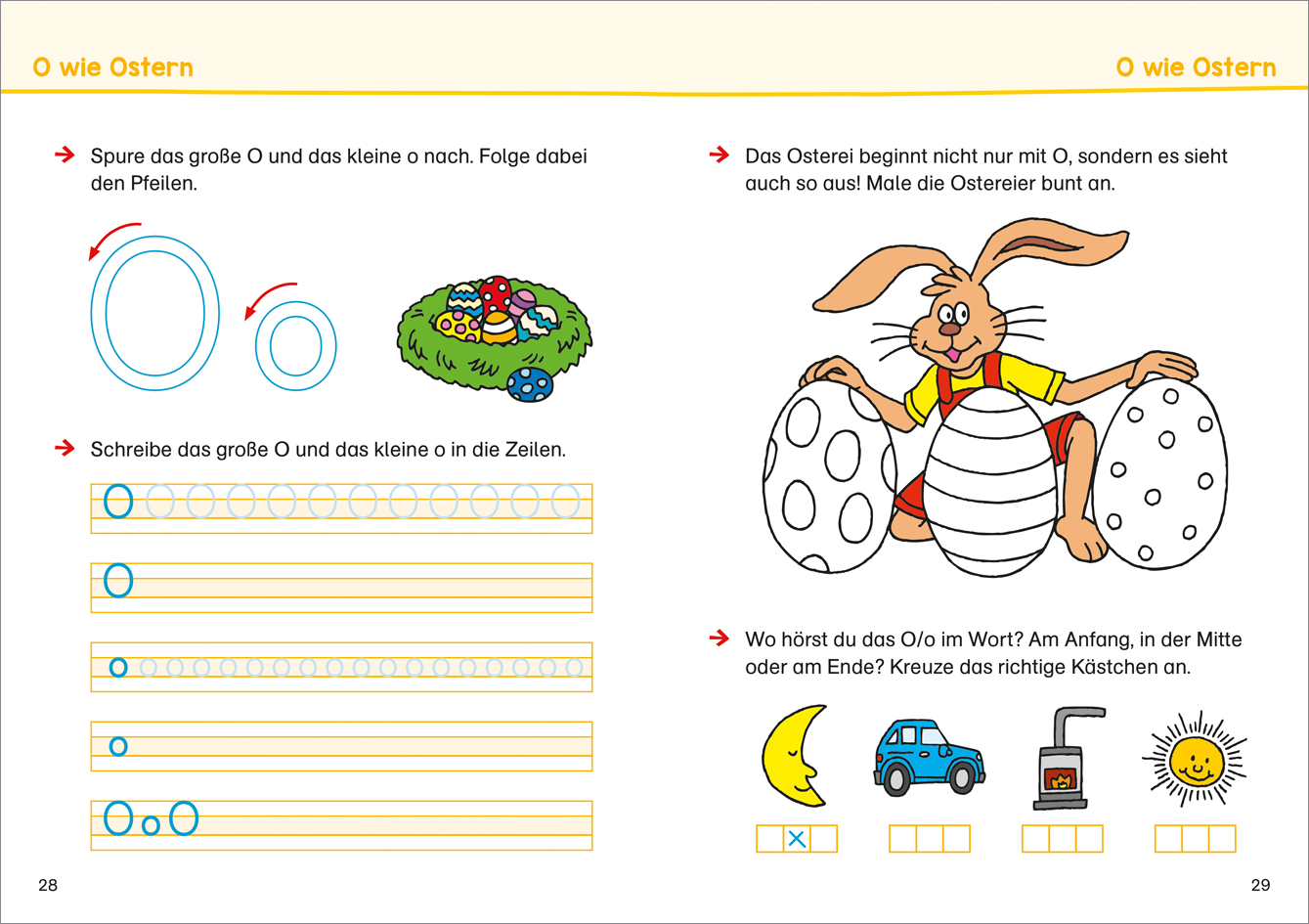 Von A wie Affe über F wie Fisch bis Z wie Zebra lernen Kinder die Druckbuchstaben des Alphabets kennen. Die Groß- und Kleinschreibung jedes einzelnen Buchstabens wird mit Pfeilen für die korrekte Schreibrichtung vorgestellt. Farbig hinterlegte Buchstaben zum Nachspuren sowie Zeilen mit Hilfslinien laden die Kinder zu ersten eigenen Schreibversuchen ein. Zusätzliche Übungen mit Bildern, Rätseln und Malaufgaben helfen dabei, die erarbeiteten Buchstaben wiederzuerkennen und zu verinnerlichen. Bunter Lernspaß für die Zeit rund um den Schulanfang und Motivation für alle, die endlich so richtig mit dem Lernen loslegen wollen!