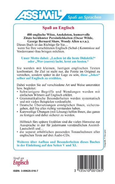 978-3-89625-016-2 Assimil Spaß an EnglischLehrbuch mit Witzen, Anekdoten und humorvollen Zitaten berühmter Persönlichkeiten"Spaß an Englisch" richtet sich an alle, die bereits über gute Englisch(Schul-)kenntnisse verfügen und eine kurzweilige Lektüre suchen, bei der man entspannt und ohne Lerndruck das Hör- undLeseverständnis verbessern kann. Parallel dazu werden die Ausdrucksfähigkeit geschult und nebenbei Wortschatz- und Grammatikkenntnisse aufgefrischt. Es basiert auf 400 Witzen, Limericksund amüsanten Zitaten und lädt Sie zu einer vergnüglichen Reise durch die Welt des britischen undamerikanischen Humors ein.Dabei sollen Sie jedoch nicht nur passiv hören und lesen und dann zur nächsten Geschichte weiterblättern. Nein, Ihr Ziel sollte sein, jede Anekdote, nachdem Sie sie angehört und gelesen und sich mit der Aussprache, dem Wortschatz und der Grammatik vertraut gemacht haben, nacherzählen zu können. Wenn Sie dies beherzigen, können Sie sicher sein, daß Sie von Ihrer Reise durch die Welt des Humors mit zahlreichen unterhaltsamen Souvenirs und nachhaltigen Erinnerungen zurückkehren.Dabei werden Sie auf verschiedene Art und Weise unterstützt bzw. begleitet: -Schwierigere Begriffe und Wendungen werden mit einfachen Wörtern auf Englisch erklärt.-Grammatikalische Besonderheiten werden systematisch und mit vielen Beispielen verdeutlicht.-Deutsche Übersetzungen ermöglichen Ihnen, sicherzugehen, daß Sie alles richtig verstanden haben.-Kurzweilige Übungen (mit Lösung) helfen Ihnen, das ganze zu festigen und dabei sicherer zu werden.Hilfreich fürs spätere Erzählen sind die vielen Hinweise zur Aussprache in der für jedermann verständlichen Assimil-Lautschrift und. -die separat erhältlichen passenden Tonaufnahmen aller englischen Texte auf drei Audio-CDs.