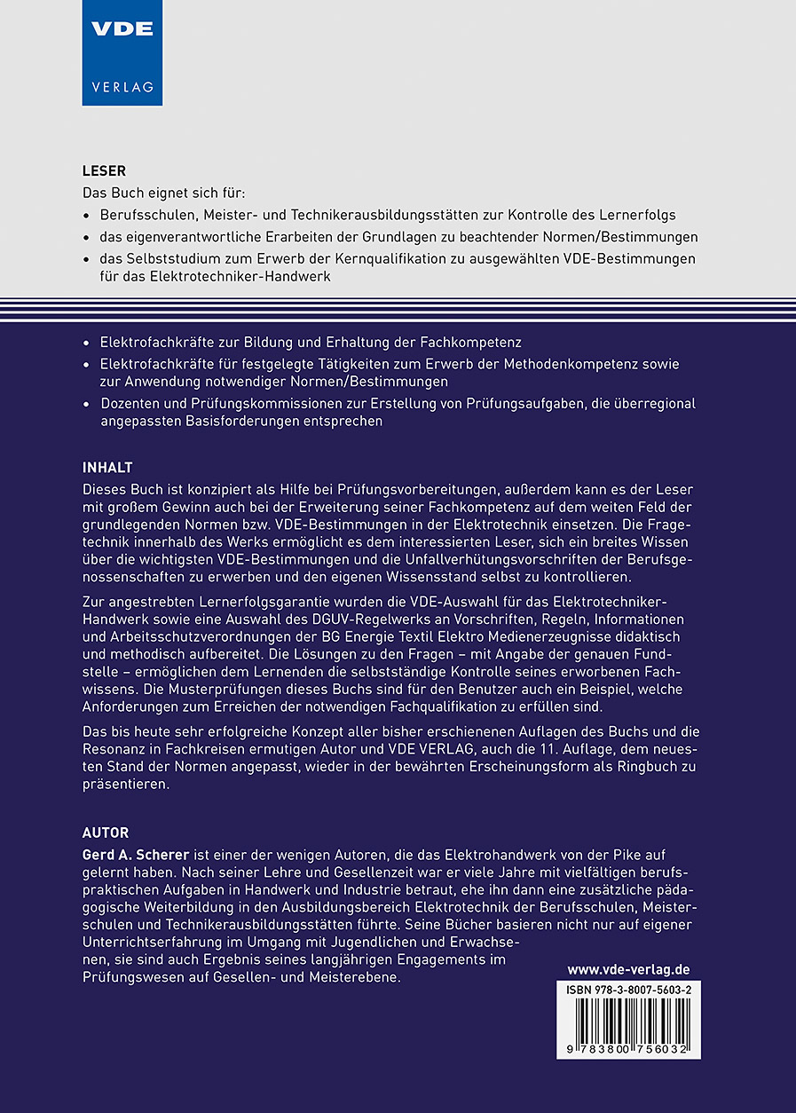 Dieses Buch ist konzipiert als Hilfe bei Prüfungsvorbereitungen, außerdem kann es der Leser mit großem Gewinn auch bei der Erweiterung seiner Fachkompetenz auf dem weiten Feld der grundlegenden Normen bzw. VDE-Bestimmungen in der Elektrotechnik einsetzen. Die Fragetechnik innerhalb des Werks ermöglicht es dem interessierten Leser, sich ein breites Wissen über die wichtigsten VDE-Bestimmungen und die Unfallverhütungsvorschriften der Berufsgenossenschaften zu erwerben und den eigenen Wissensstand selbst zu kontrollieren.Zur angestrebten Lernerfolgsgarantie werden die VDE-Auswahl für das Elektrotechniker-Handwerk sowie eine Auswahl des DGUV-Regelwerks an Vorschriften, Regeln, Informationen und Arbeitsschutzverordnungen der BG Energie Textil Elektro Medienerzeugnisse didaktisch und methodisch aufbereitet. Die Lösungen zu den Fragen - mit Angabe der genauen Fundstelle - ermöglichen dem Lernenden die selbstständige Kontrolle seines erworbenen Fachwissens. Die Musterprüfungen dieses Buchs sind für den Benutzer auch ein Beispiel, welche Anforderungen zum Erreichen der notwendigen Fachqualifikation zu erfüllen sind.Das bis heute sehr erfolgreiche Konzept aller bisher erschienenen Auflagen des Buchs und die Resonanz in Fachkreisen ermutigen Autor und VDE VERLAG, auch die 11. Auflage, dem neuesten Stand der Normen angepasst, wieder in der bewährten Erscheinungsform als Ringbuch zu präsentieren.