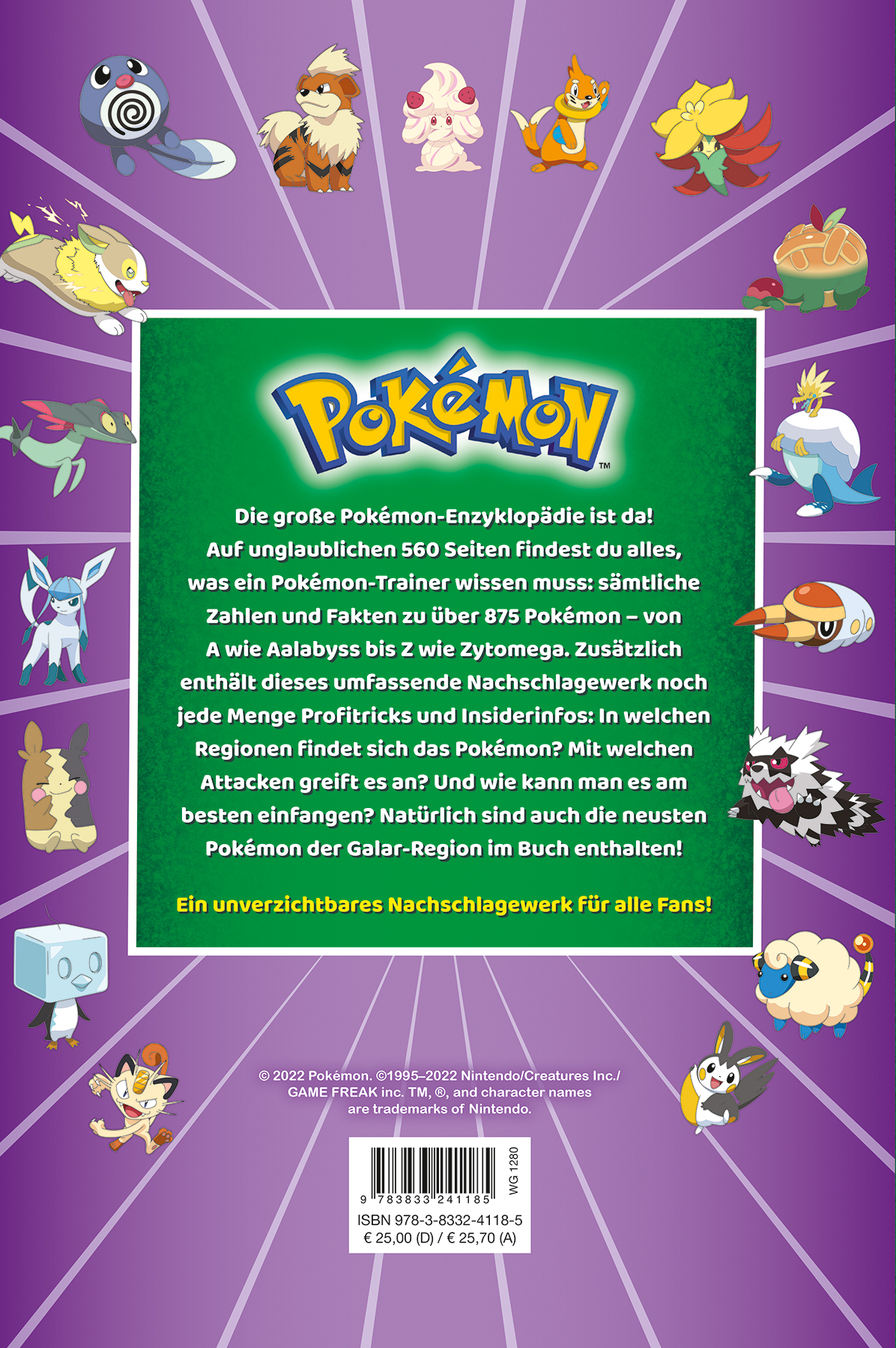 Die große Pokémon-Enzyklopädie ist da! Auf unglaublichen 560 Seiten finden Fans alles, was ein Pokémon- Trainer wissen muss: Sämtliche Zahlen und Fakten von über 900 Pokémon - von A wie Aalabyss bis Z wie Zytomega. Zusätzlich enthält dieses umfassende Nachschlagewerk noch Profi-Tricks und Insider-Infos: In welchen Regionen findet sich das Pokémon? Mit welchen Attacken greift es an? Und wie kann man es am besten einfangen? Natürlich sind auch die neusten Pokémon der Galar-Region im Buch enthalten. Ein unverzichtbares Nachschlagewerk für alle Fans!