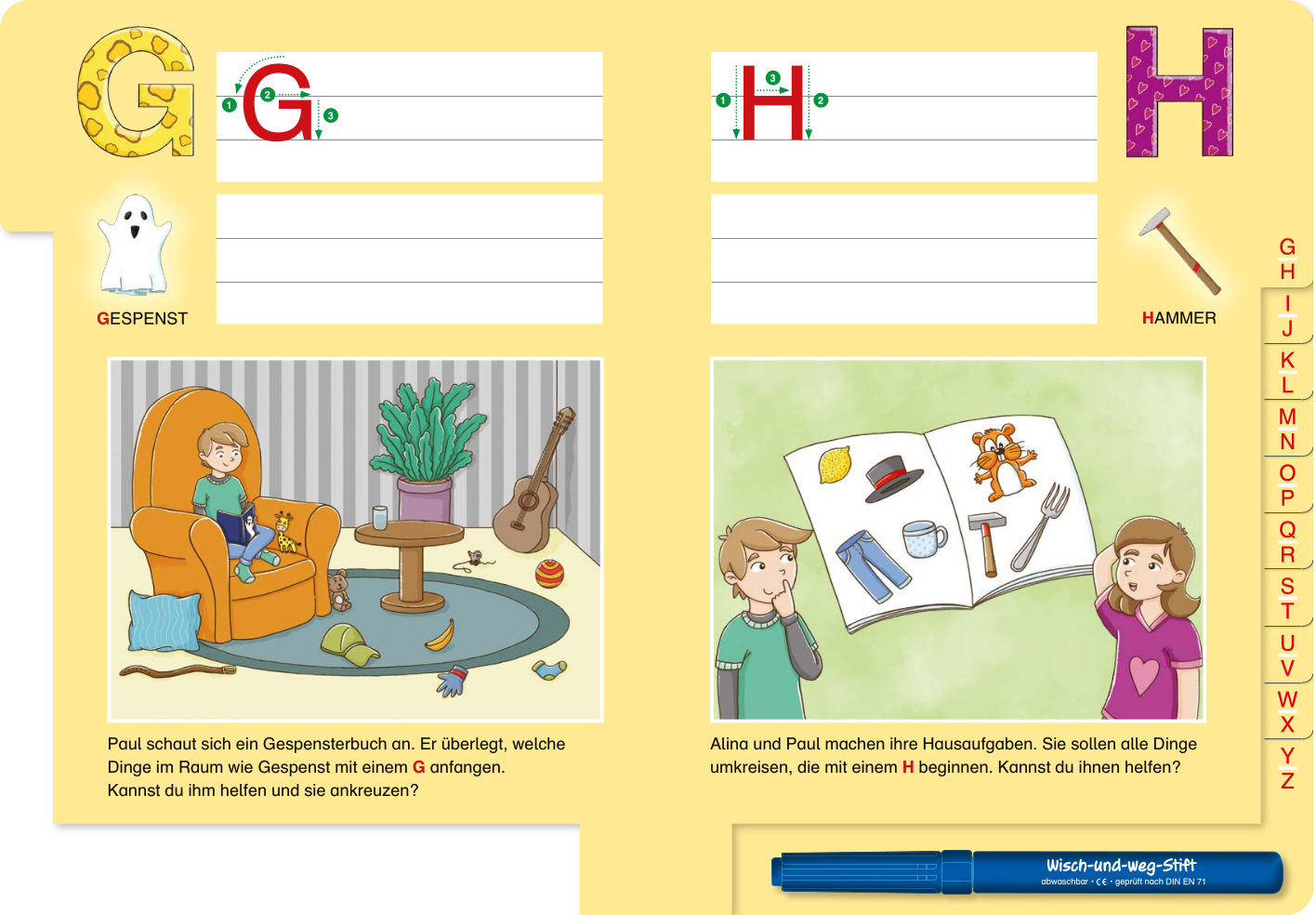 Mit viel Spaß und Fantasie werden so das erste Schreiben, logisches Denken und die Feinmotorik gefördert. Pfeile an den Buchstaben zeigen den Kindern die richtige Schreibweise auf.
