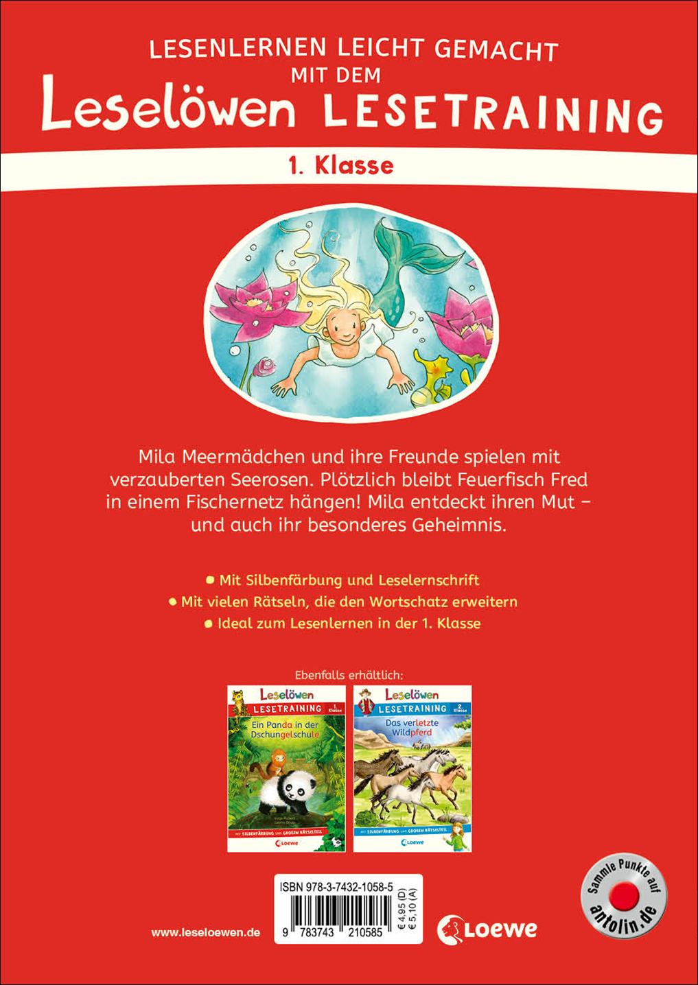 Mila Meermädchen und ihre Freunde spielen mit verzauberten Seerosen. Aber dann wird es gefährlich: Feuerfisch Fred taucht zu tief und bleibt in einem Fischernetz hängen! Mila entdeckt ihren Mut und auch ihr besonderes Geheimnis. Mit dem Leselöwen Lesetraining für die erste Klasse können Kinder schon ganz allein ihr erstes eigenes Buch lesen. In jedem Buch wartet eine spannende Geschichte mit vielen bunten Bildern, kurzen Sätzen und kleinen Texteinheiten, die jeweils in Sinnschritte unterteilt sind. Die große Schrift wurde extra für Leseanfänger entwickelt und ist auch für Kinder mit Legasthenie geeignet. Die farbigen Silben erleichtern das Lesenlernen und die Kreuzwort- und Punkterätsel sorgen für Abwechslung. Ganz nebenbei trainieren die Rätsel auch noch den Wortschatz.