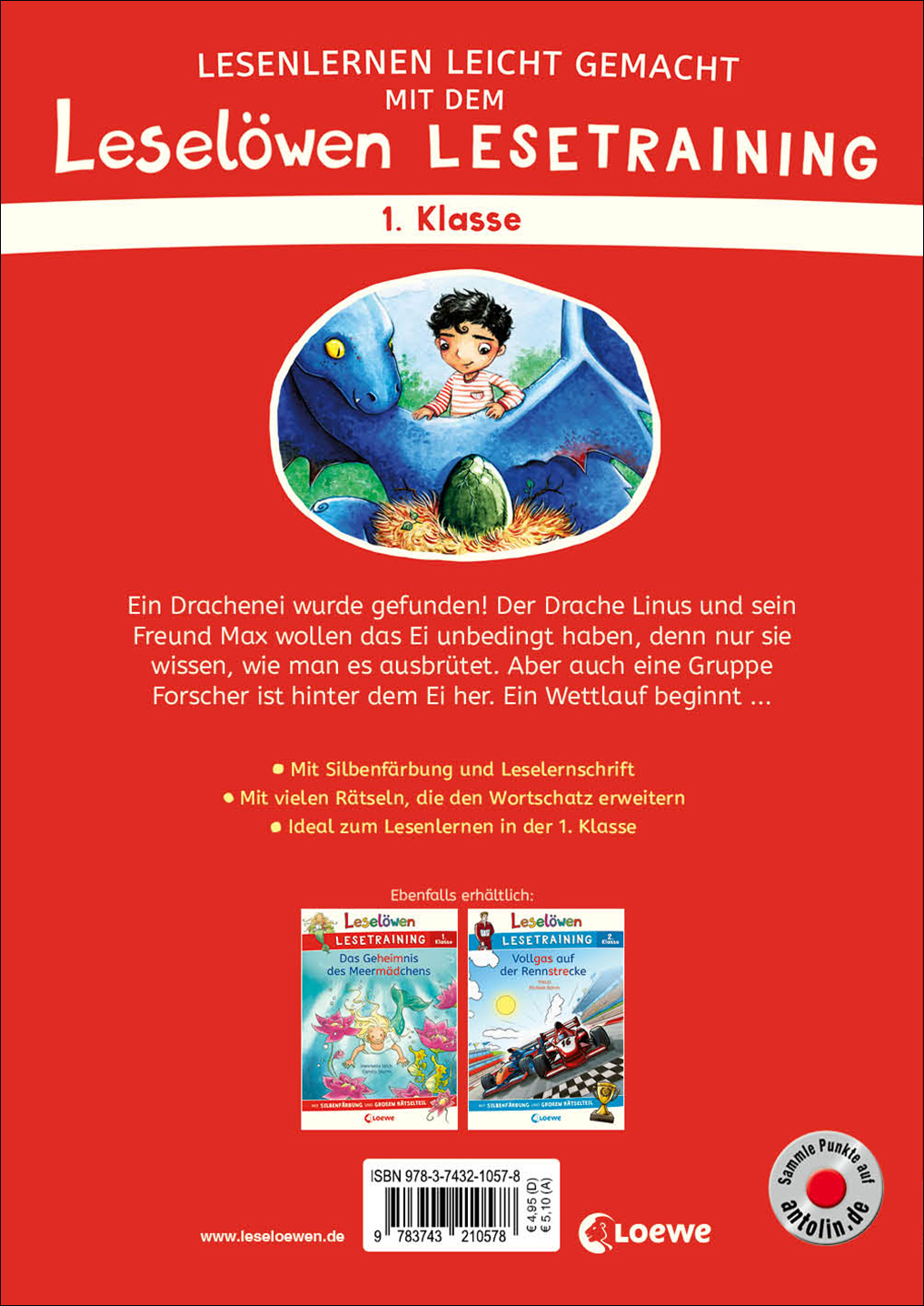 Ein seltenes Drachenei wurde gefunden! Der Drache Linus und sein Freund Max wollen das Ei unbedingt haben, denn nur sie wissen, wie man es ausbrütet. Aber auch eine Gruppe Forscher ist hinter dem Ei her. Ein Wettlauf beginnt. Ob am Ende ein Drache schlüpft? Mit dem Leselöwen Lesetraining für die erste Klasse können Kinder schon ganz allein ihr erstes eigenes Buch lesen. In jedem Buch wartet eine spannende Geschichte mit vielen bunten Bildern, kurzen Sätzen und kleinen Texteinheiten, die jeweils in Sinnschritte unterteilt sind. Die große Schrift wurde extra für Leseanfänger entwickelt und ist auch für Kinder mit Legasthenie geeignet. Die farbigen Silben erleichtern das Lesenlernen und die Kreuzwort- und Punkterätsel sorgen für Abwechslung. Ganz nebenbei trainieren die Rätsel auch noch den Wortschatz.